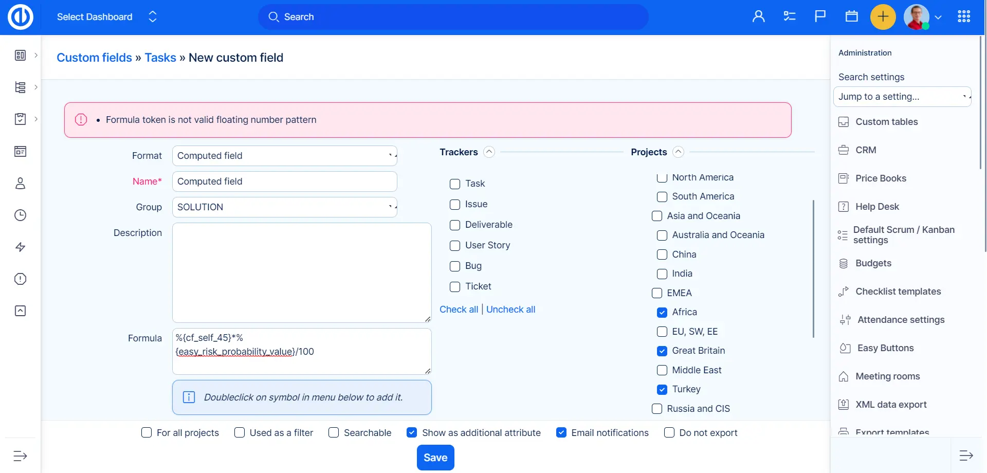 Тази функция ви позволява да изчислите стойност, базирана на данните, събрани от други полета. Това може да се направи за всяка системна единица т.е. задачи, проекти, времеви записи, и т.н. Прост пример: ново поле „оставащо време“ може да бъде изчислено като: общо оценено време минус реално изминало време.