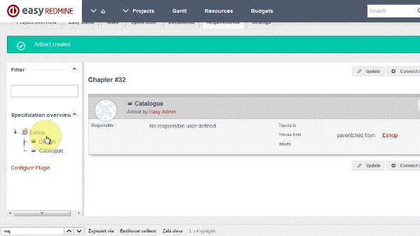 Управлението на изискванията е полезно за технически сложни проекти, където много малки компоненти и детайли съставят голям и впечатляващ продукт (като автомобил или машина). Просто създайте артефакти, които представят основните атрибути в дървовидната структура на изискванията. Управлението на изискванията е отделен плъгин за Easy Redmine. Тъй като не е включен в основното управление на проекта, трябва да бъде закупен отделно в клиентския портал.