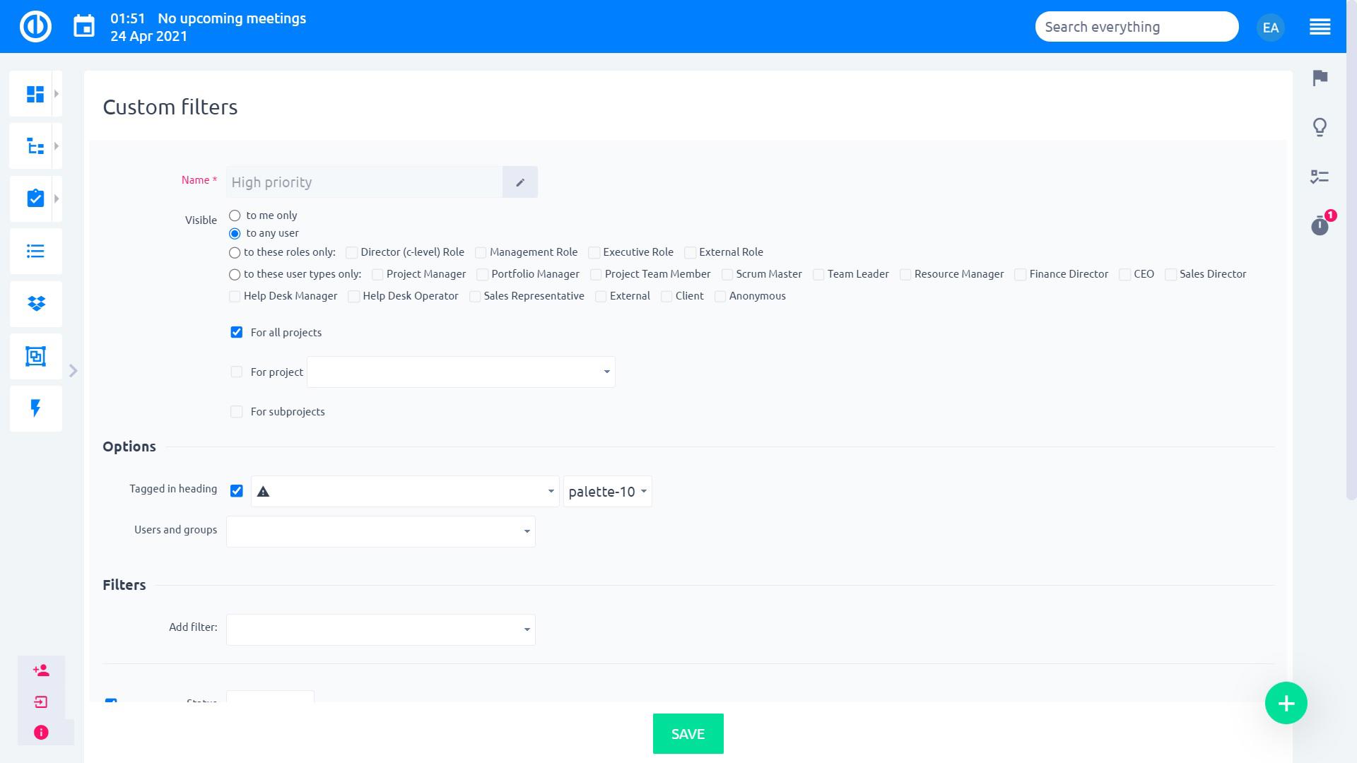 Ново персонализирано поле за цветови формат може да бъде добавено към всяка поддържана единица, като проекти, задачи, контакти и други. Потребителите могат да изберат между три цвята (флагове) - зелен, оранжев и червен. Всяко цветово представлява ръчно избран индикатор и е на потребителите да решат какво значение да му придадат. Употреба: Разходи по бюджета - зелен, Съответствие на графика - оранжев, Отзивчивост на клиента - червен.