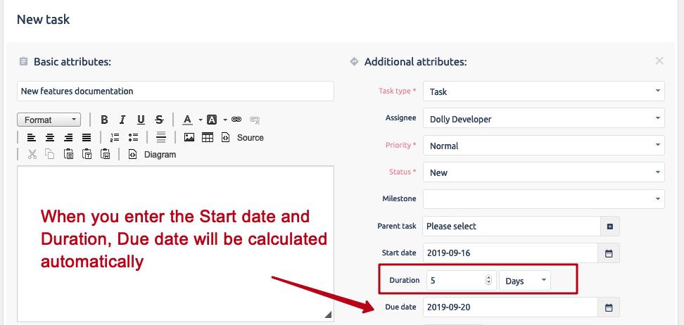 Когато планираме задачи в Easy Redmine, трябва да зададем начална и крайна дата, за да информираме потребителите, кога очакваме задачите да бъдат изпълнени. Но мениджърите, които са работили с Microsoft Project (MSP) преди, не искат да добавят "крайна дата" ръчно, те очакват, че могат да зададат началната дата и продължителността на задачата, докато крайната дата се изчислява автоматично. Затова ние предлагаме решение на този проблем - изчисляване на крайна дата чрез продължителност на задачата.