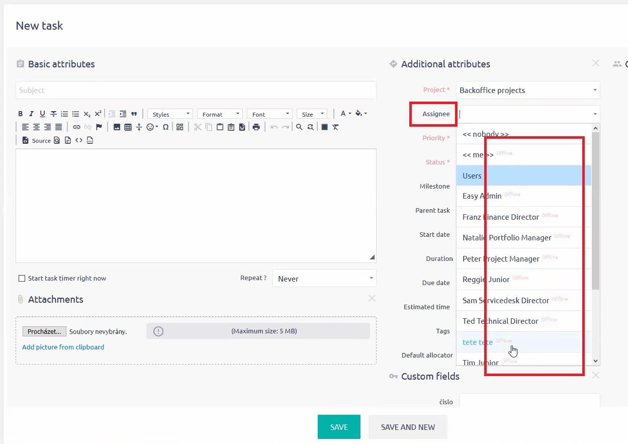 Когато избирате изпълнител на задача, виждате неговият/нейният статус на присъствие, за да не поставите задачата на човек, който е на почивка или болен. Тази функция трябва да предотврати необходимостта от ненужно пренасочване на задачи.