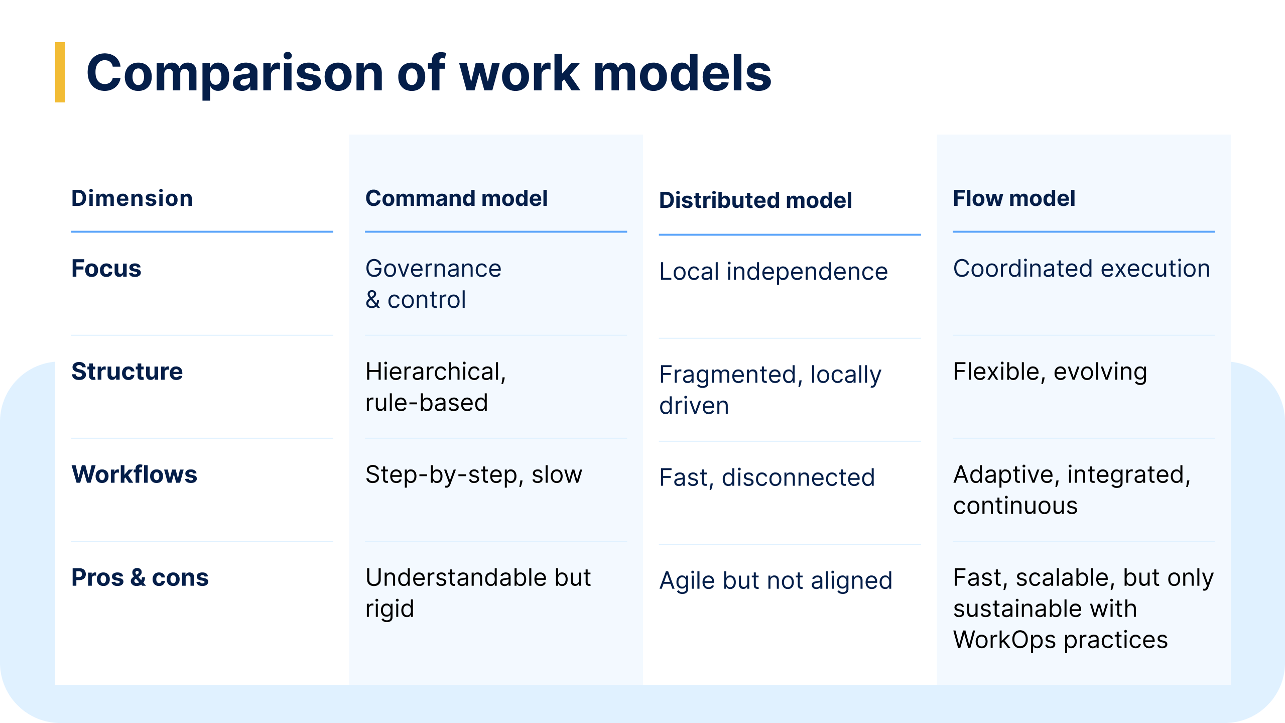 The Flow model represents a coordinated, integrated way of working where teams move quickly but remain aligned through shared context, data, and goals.