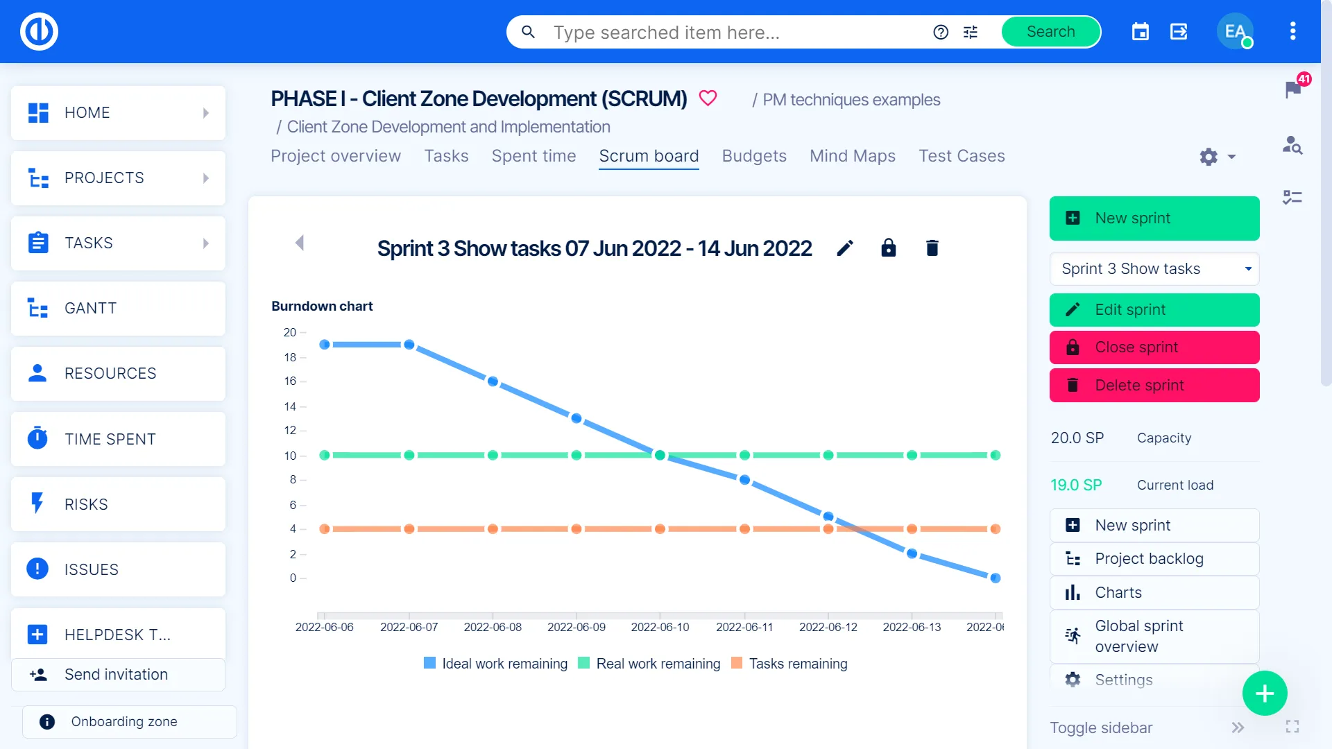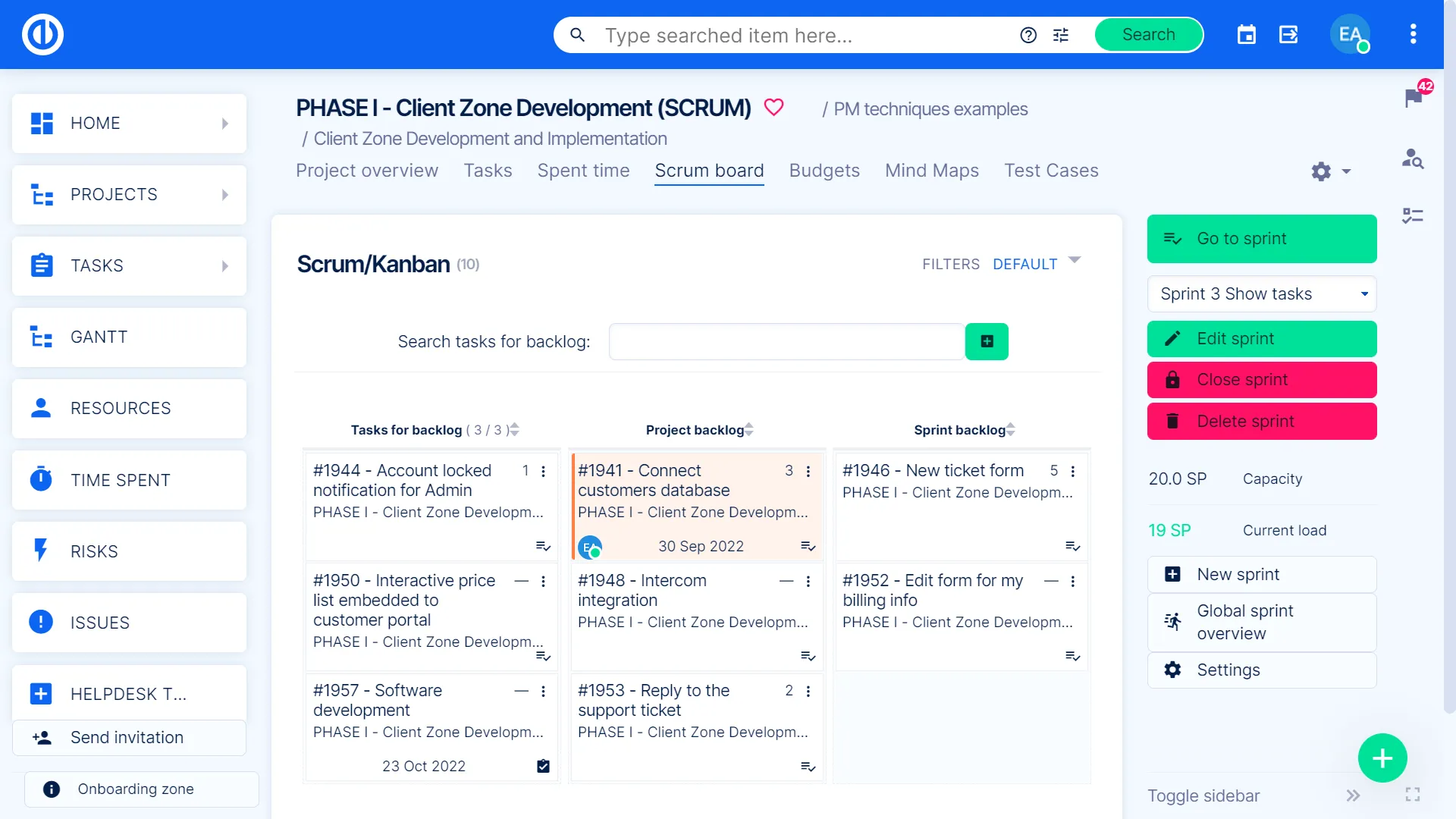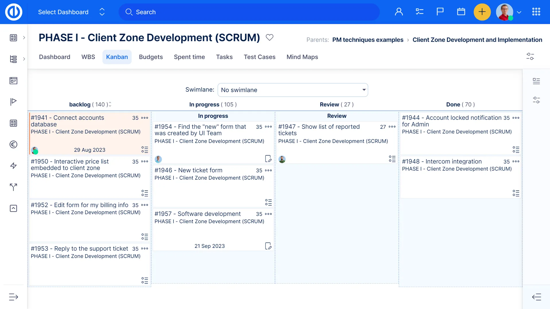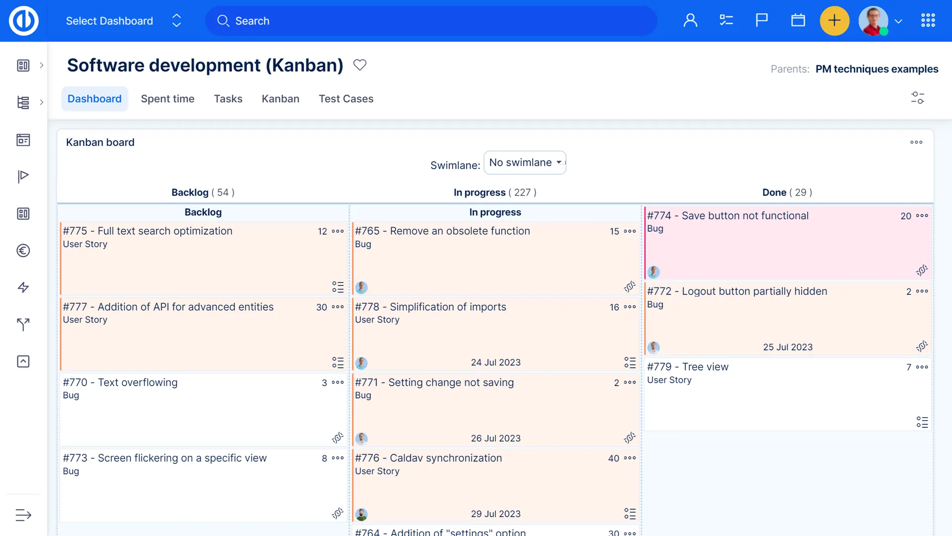 O painel ágil do Easy Redmine é uma funcionalidade para desenvolvimento ágil, adequado ao Scrum e Kanban, que permite que você trabalhe com atrasos, adiantamentos, tarefas pendentes e seus status. O principal benefício do Easy Redmine é a habilidade de combinar gestões clássicas e ágeis em apenas uma solução. Pode ser usado para apoiar processos em outros departamentos como RH ou Finanças.