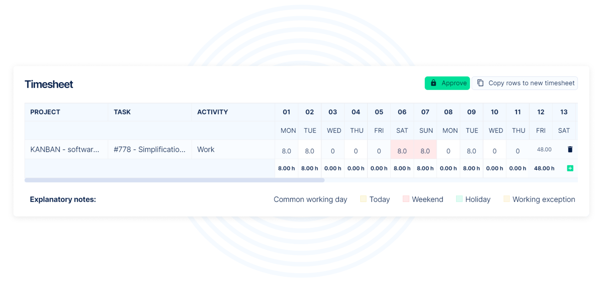 当Redmine Timesheet准备就绪时,可以将其锁定并发送给经理进行审批。因此,经理可以对下属工人的花费时间有一个概览。这可以轻松地简化您的时间管理中的整个审批流程。