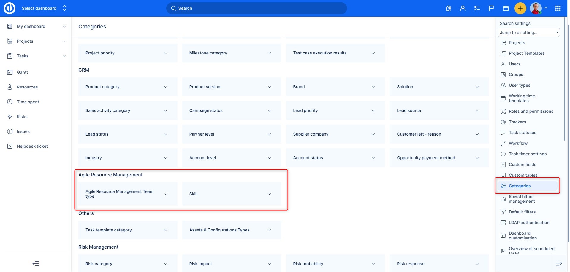 To add a new team or skill to Agile Resource Management, navigate to Administration >> Categories >> Agile Resources where you find both options in one place. Of course, besides adding new teams and skills, you can also edit or remove existing ones.