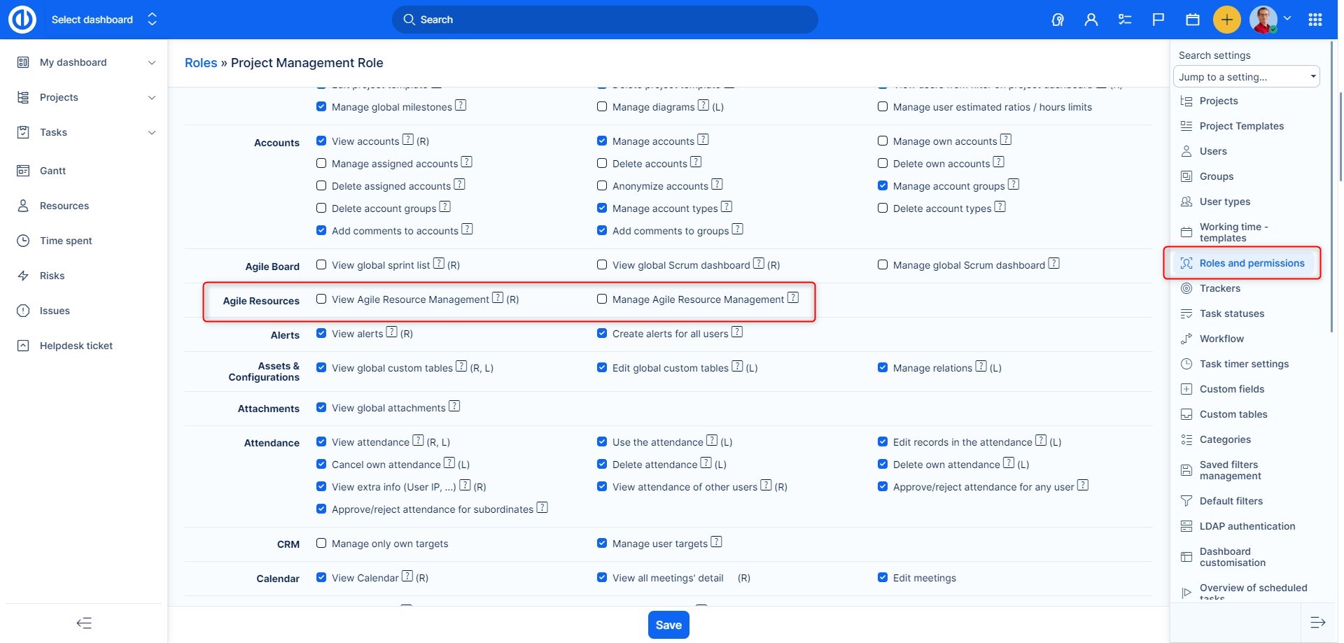 We should not forget to set user permissions, in Administration >> Roles and permissions >> select a role >> Global permissions >> Agile Resources. Here you simply check whether the relevant user role has the right to view Agile Resource Management and whether it can manage it (i.e. make changes to it).