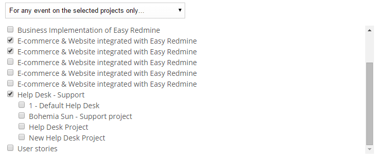 - For any event on selected projects only = This is the same as the first option, with a difference, You can select specific project about which you want to get those notifications. For unselected projects, you will only receive notifications about things you watch or you're involved in (eg. tasks you're the author, assignee or coworker).