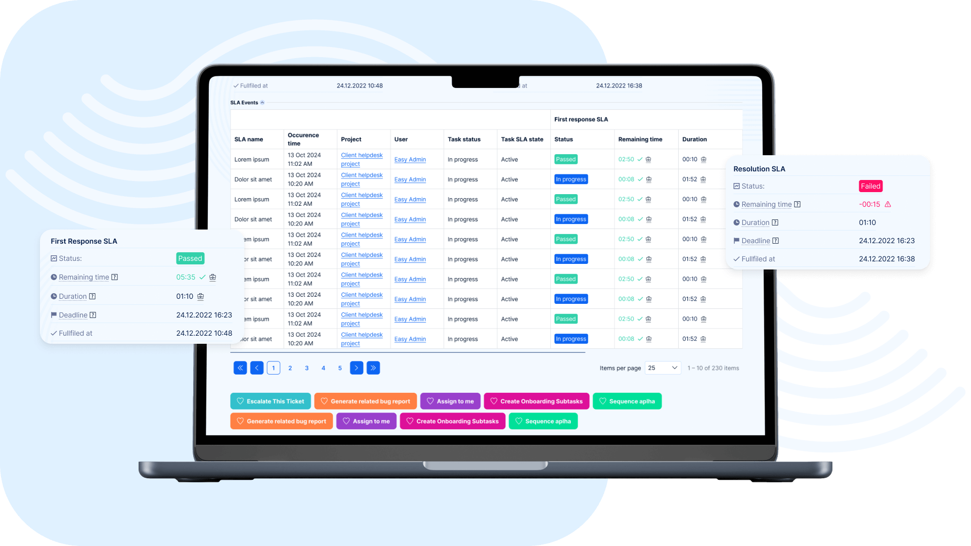 - Tickets now display live SLA data for both First Response and Resolution: Status, Remaining time, Duration, Deadline, and Fulfilled at.