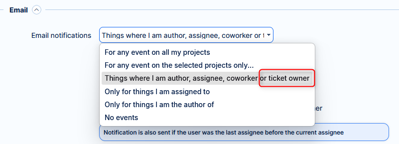 User selected as Ticket owner (this field only exists with Help desk) can newly receive email notifications.