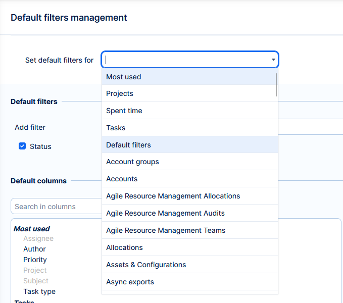 Selection of the entity type in Administration >> Default filters has improved. It is now an autocomplete dropdown, with tasks preset as default.