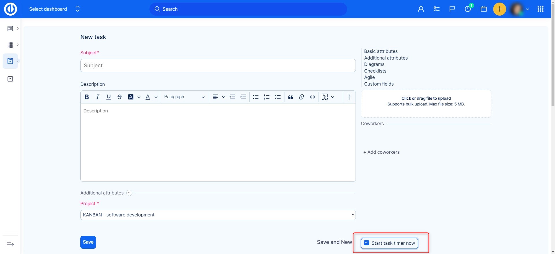This is another way to log time from a task itself. When you open a task and you are ready to start working, click on the respective button in the right sidebar. The status of the task will change and the assignee will be automatically changed to the current user. You can then choose to pause, in which case the timer will stop. When you get to this task again, just click on the "Continue" button. When you finish working on the task, click on the "Finish" button. The time logging page will be automatically pre-filled according to how long you had the timer on. All you have to do is fill in the desired attributes and click "Save".