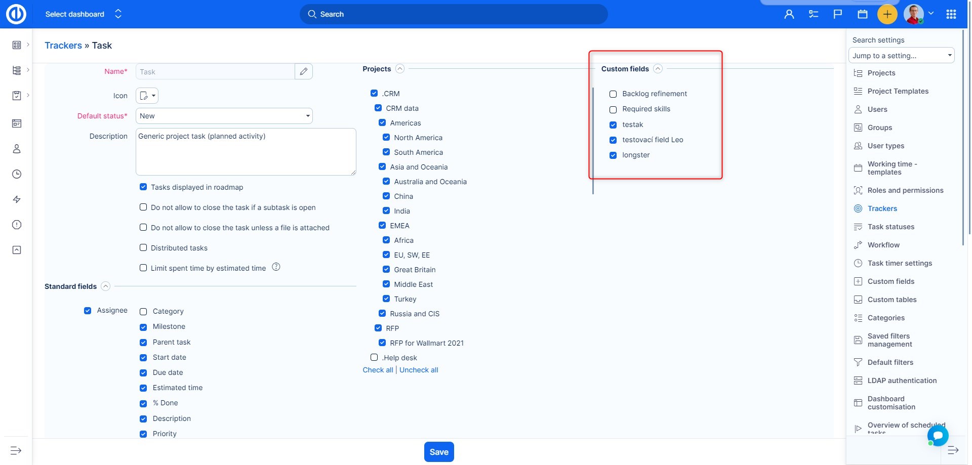- If you are trying to add a task type to a project (via Administration >> Task types >> new/edit), the selected projects must have all required custom fields filled in. Otherwise, you will get an error message that some projects are invalid. We recommend setting all project custom fields as not-required when you are adding task types. Once you have all task types added, you can set the custom fields as required again.