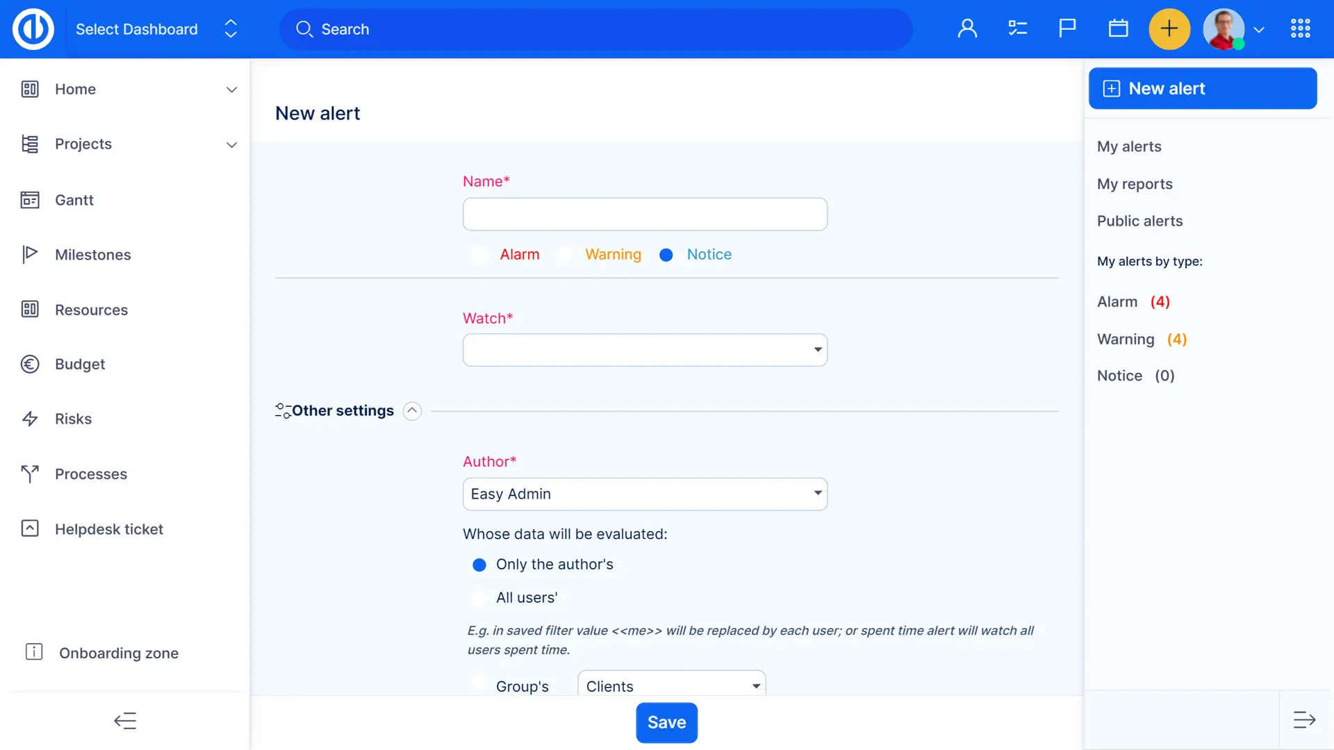 Alertas de Easy Redmine está aquí para enviarte notificaciones sobre las actualizaciones que son especialmente relevantes para ti. Los usuarios pueden definir sus propias alertas y recibir notificaciones por email si se cumplen las condiciones. Las alertas típicas incluyen fechas límite, presupuestos excedidos, tareas pendientes, etc.