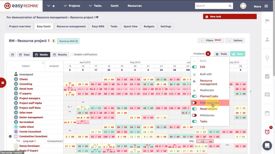 Resource Management erraz eta bisuala da Easy Redmine 2019-ekin. Profesionalen planifikazioa eta lana Easy Redmine eta Redmine-n laneratzeko tresna da. Kudeatzaileek proiektuetan lana planifikatzen dute langileen kapazitate errealak eta zereginaren egiteko estimazio denborarekin kontuan hartuta. Informazio gehiago ikasteko, ikusi webgunearen grabaketa (behean).