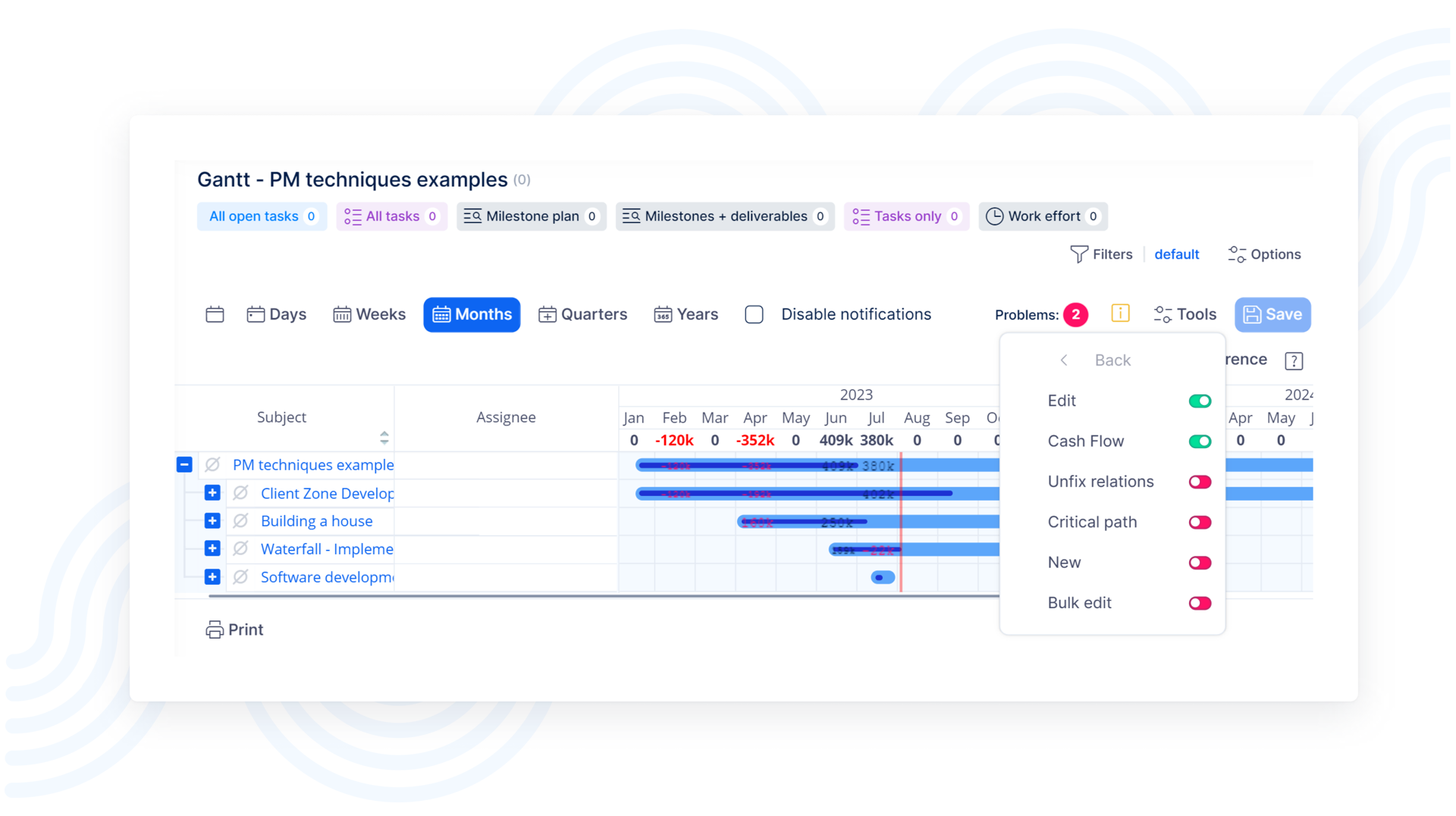Seuraa helposti käteisvirtaa projektissasi käyttämällä Cashfows-liitännäistä. Aktivoi se Gantt-kaaviossasi saadaksesi nopean yleiskuvan suunnitelluista ja todellisista käteisvirroista ajan kuluessa globaalilla ja projektitasolla.