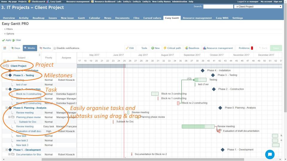 Με το Easy Gantt για το Redmine και το Easy Redmine, έχετε ένα ισχυρό εργαλείο προγραμματισμού στα χέρια σας, βασισμένο σε μια γραφική επισκόπηση (γράφημα γραμμής) και ένα πρόγραμμα των όλων των εργασιών (θεμάτων) που ανήκουν είτε σε ένα συγκεκριμένο έργο είτε παγκοσμίως σε όλα τα έργα.