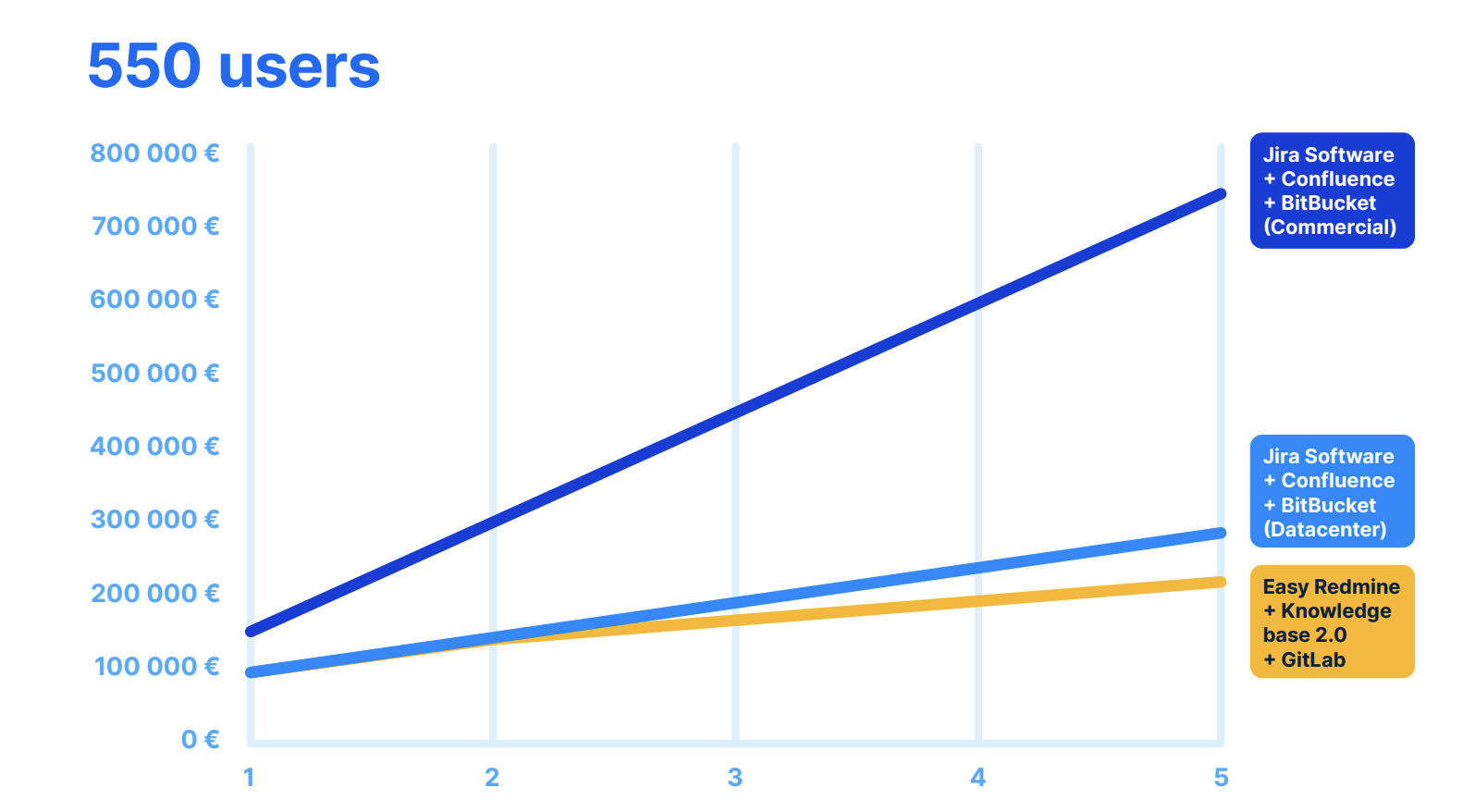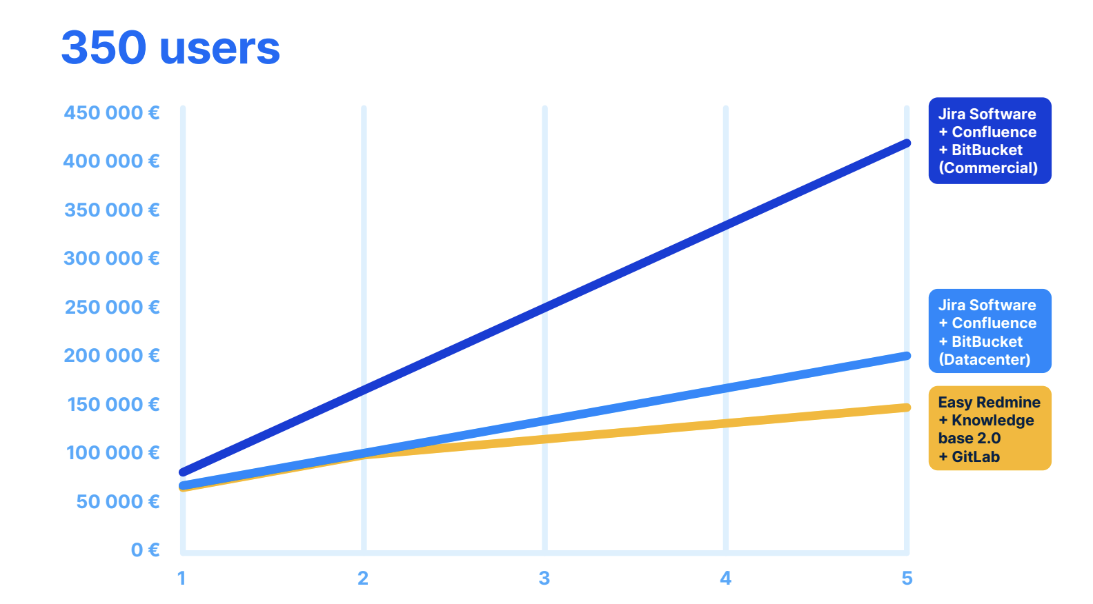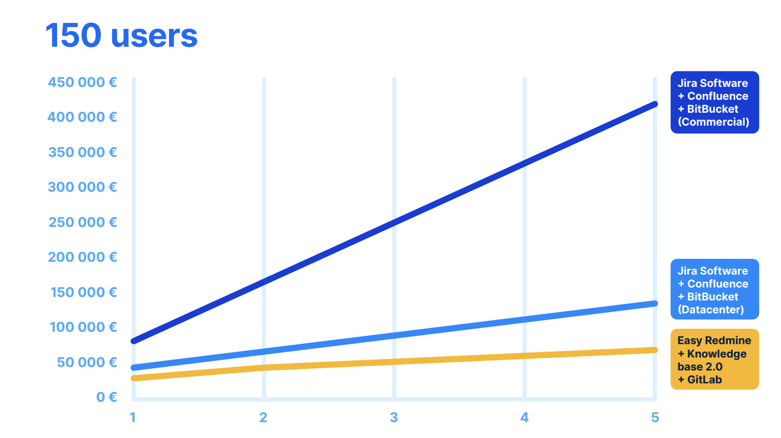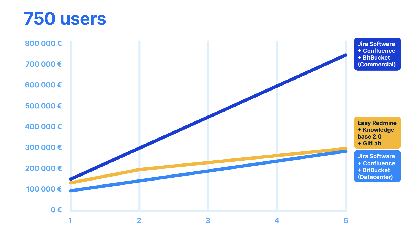 Είναι η άδεια Atlassian Data Center πολύ ακριβή για εσάς; Φυσικά και είναι! Πληρώστε λιγότερο για τους χρήστες σας και μειώστε το συνολικό κόστος σας. Η τιμολόγηση του Easy Redmine έχει σχεδιαστεί για να είναι σαφής και κατανοητή, χωρίς κρυμμένες δαπάνες.