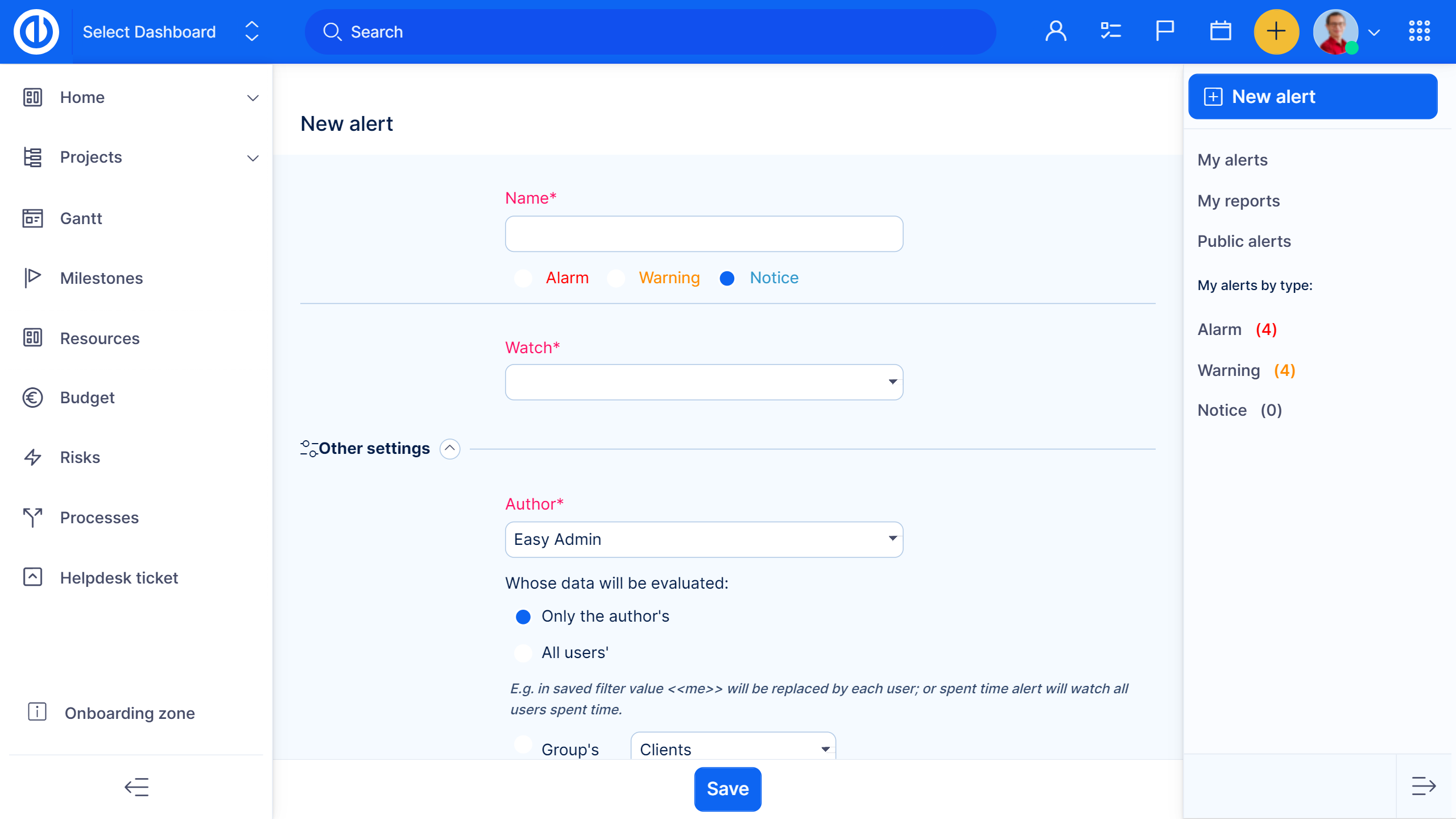 Pemberitahuan Easy Redmine hadir untuk memberi tahu Anda tentang pembaruan yang relevan khusus untuk Anda. Pengguna dapat menentukan pemberitahuan mereka sendiri dan mendapatkan pemberitahuan melalui e-mail jika kondisi yang ditentukan terpenuhi. Pemberitahuan yang umum meliputi tanggal jatuh tempo tonggak, anggaran yang melebihi batas, tugas yang terlambat, dll.