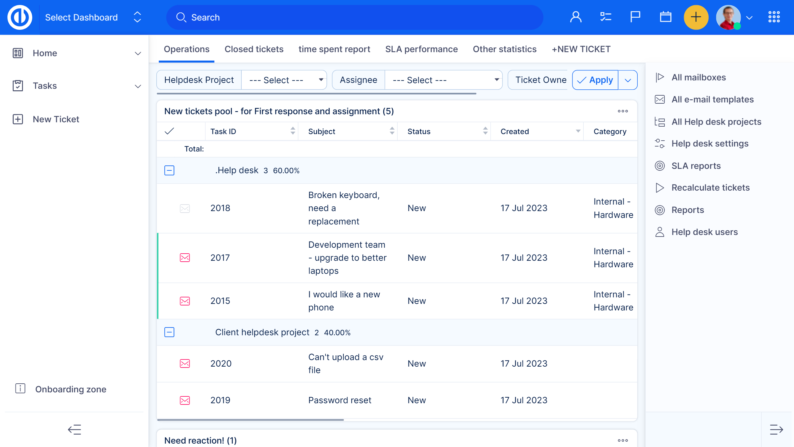 Apakah Anda ingin memiliki gambaran yang jelas tentang klien dukungan Anda? Fitur proyek HelpDesk dapat membantu Anda dengan itu! Gambaran proyek memungkinkan Anda untuk mengatur dan mengamati jumlah jam kontrak sesuai SLA, jumlah jam yang telah dikerjakan, dan sisa jam. Selain itu, ini menyediakan pemberian kode warna untuk setiap proyek, yang memberikan representasi visual yang bagus tentang status proyek saat ini. Selain itu, Anda dapat dengan mudah mengategorikan proyek Anda, misalnya berdasarkan pentingnya pelanggan tertentu atau tingkat layanan yang diberikan. Tentu saja, dalam setiap proyek tertentu, ada gambaran sendiri yang lebih rinci - laporan tiket, acara SLA, timesheet, dll.