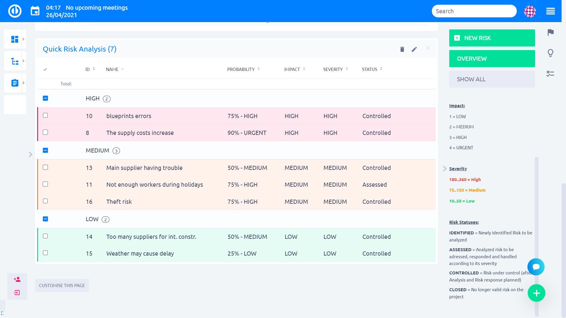 באפשרותך לנטרל את כל הסיכונים בצורה פשוטה על ידי תמונות מוצגות ב-תרשימים, גרפים, אינדיקטורים או מטריצת סיכונים. באמצעות הצגת כל הסיכונים בצורה חזותית, יהיה קל יותר להקטין ולבחור את מצב התגובה הנדרש לכל סיכון. Easy Redmine תומך גם בייצוא ל-PDF, XLS ו-CSV.