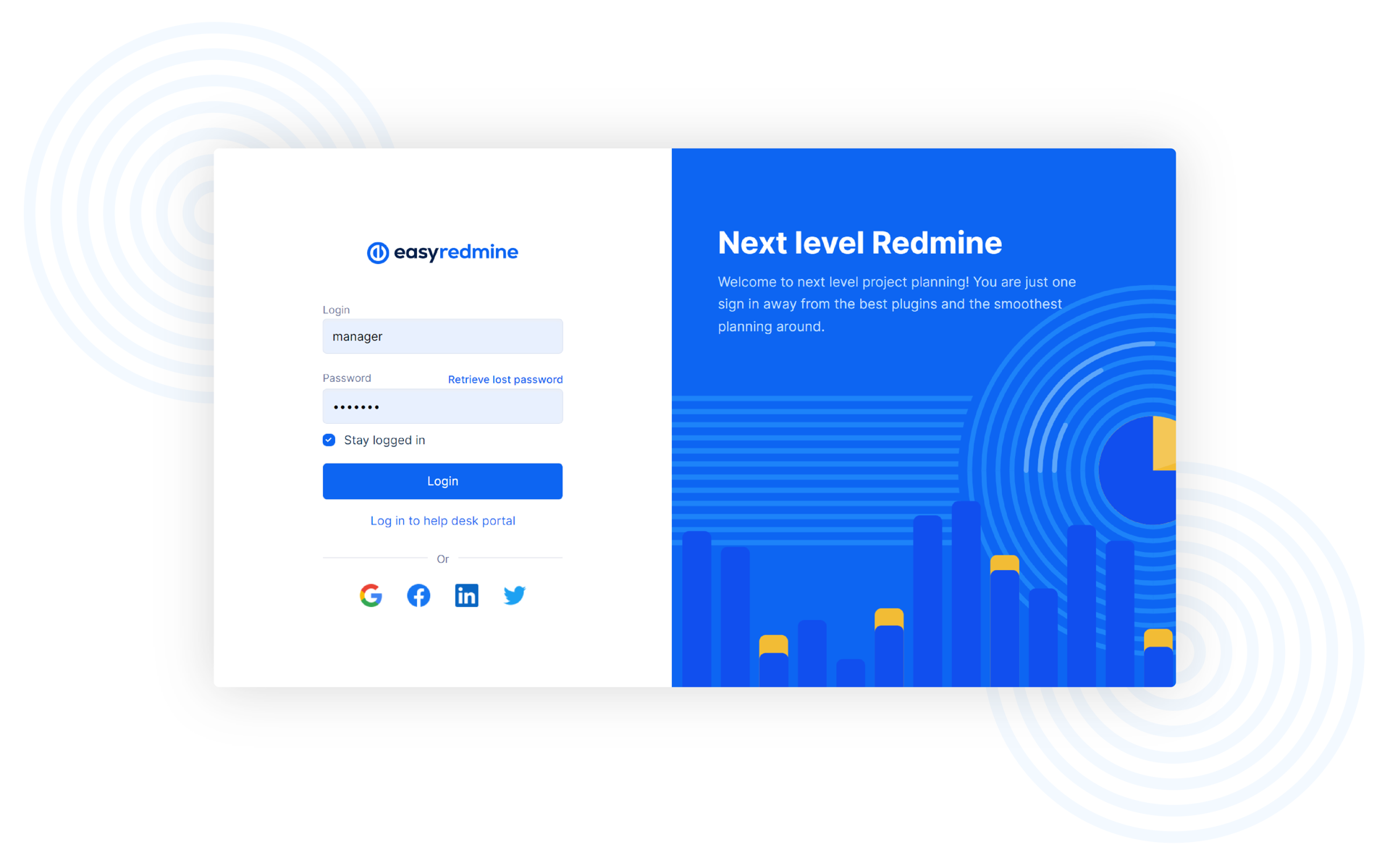 Easy Redmine è un aggiornamento completo ed estensibile di Redmine. La combinazione di un nuovo design mobile con utili plugin e funzionalità ti farà godere della gestione del tuo progetto, migliorare la comunicazione e l'esperienza utente e risparmiare tempo.