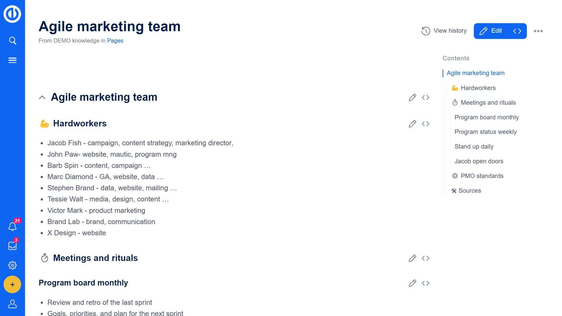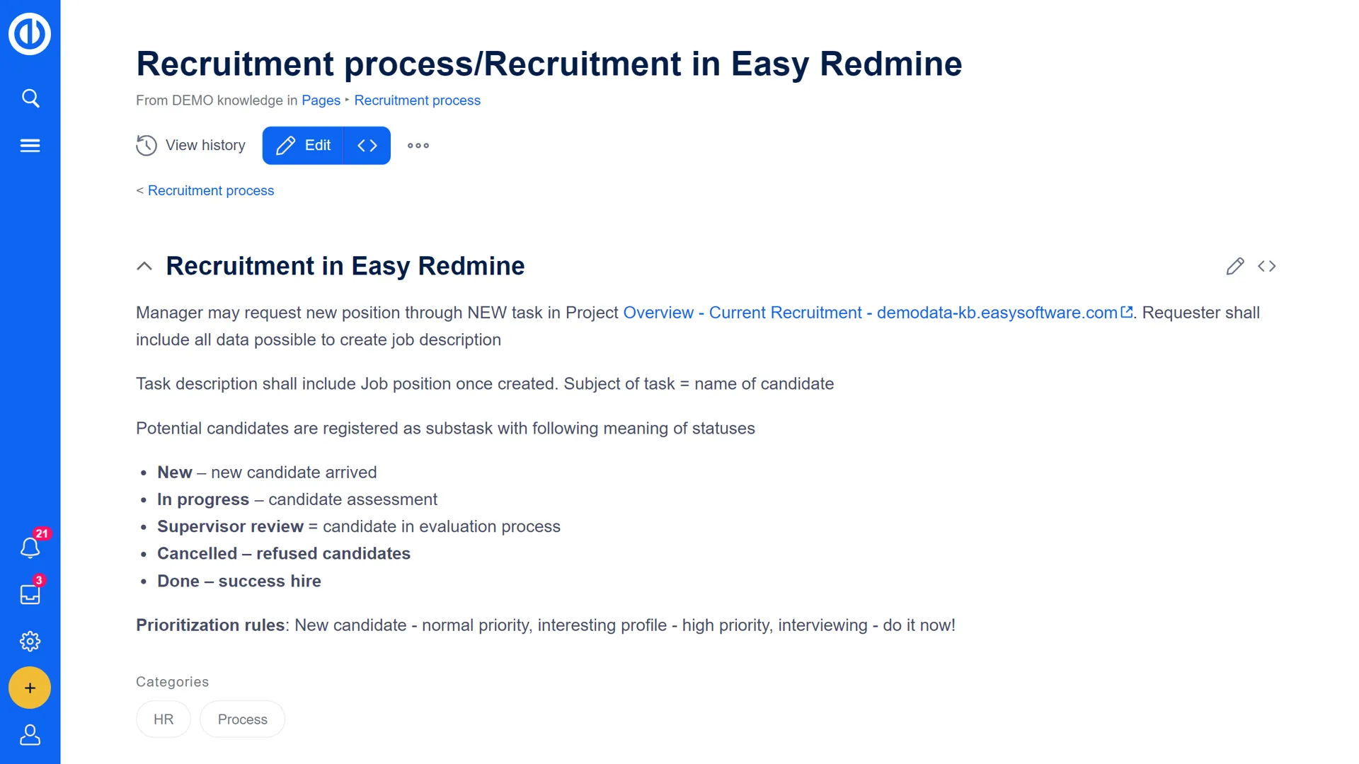 オープンソースで人気の高いMediaWiki技術とそのプロフェッショナル版ディストリビューションBlueSpiceをベースにしています。Easy Redmine環境にうまく統合され、組織内の文書、プロセス、マニュアル、品質管理、その他の知識維持のニーズを整理し、拡張するための強力なツール群を提供します。