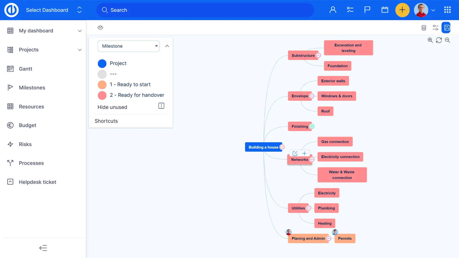Mind Map(マインドマップ)は、計画策定、ブレインストーミング、プロジェクトとプロセスの図の作成を便利にします。タスクを作成しなくても、あらゆるプロジェクトについての考えを整理するために使うことができます。WBS とは異なり、プロジェクトの開始や分析の段階では、タスクの作成や共同作業はまだ必要なく、何よりもプロジェクトやプロセスのすべての部分を分析して考える必要がある場合に使えるように設計されています。