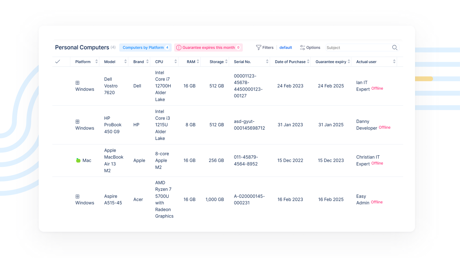 Administrer og organiser dine eiendeler og konfigurasjoner i ett verktøy. Opprett tilpassede datafelt og typer, filtre, sorterings- og visningsalternativer, alt uten behov for koding kunnskap. Alle dine eiendeler og konfigurasjoner er oppdaterte og enkle å få tilgang til.
