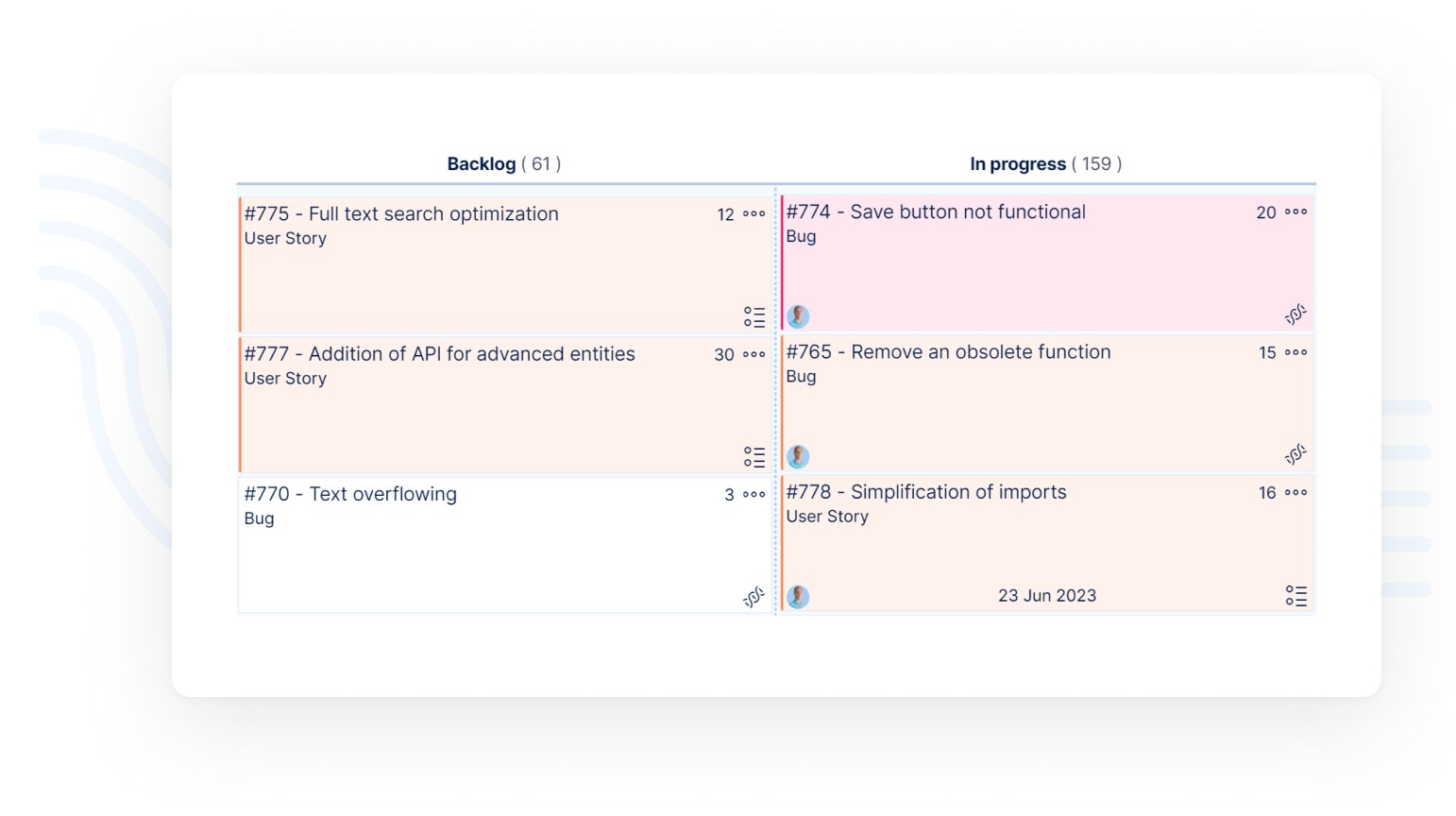 Custom Kanban tilbyr større fleksibilitet og komplementerer Prosjekt Kanban. Med oppgavefiltrering og sortering frikobler det deg fra prosjekt-og backlog-begrensninger. Opplev forbedret teamkommunikasjon, gjennomsiktighet og raskere løsning av flaskehalser.