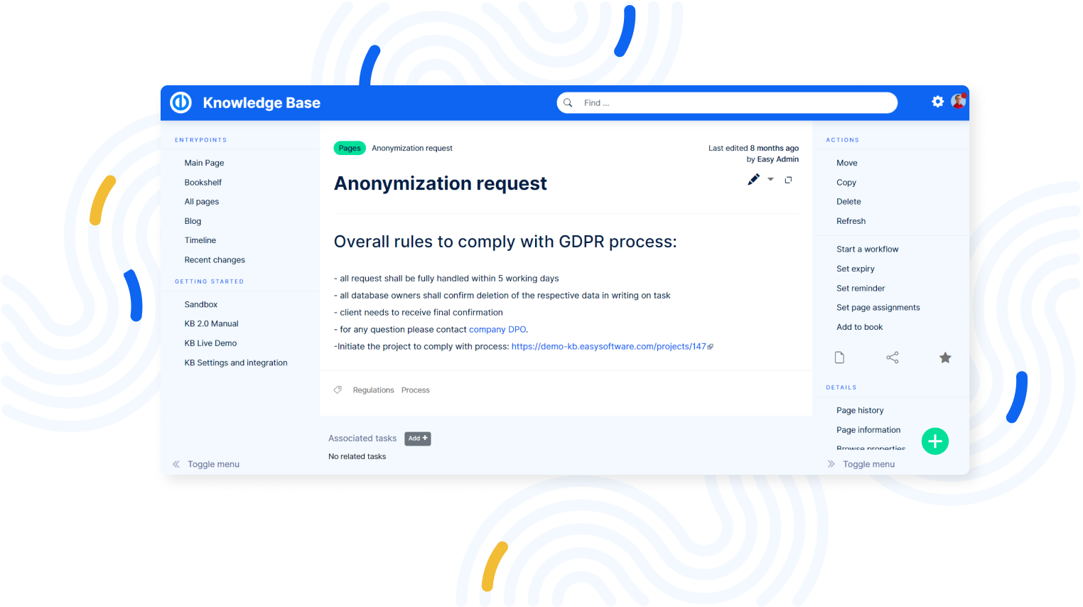 Unngå å miste bedriftens kunnskap, hold den samlet på ett sted og forbedre effektiviteten i bedriftens drift. Riktig informasjon er alltid tilgjengelig. Kunnskapsbasen bruker wiki-strukturert innhold basert på åpen kildekode MediaWiki-teknologi, kraftig søk, visuell redigering og er koblet til oppgaver.