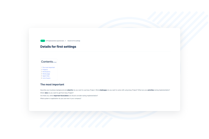W zależności od tego, czy chcesz mieć pojedynczy projekt dla wszystkich zgłoszeń, czy różnicować skrzynki pocztowe HelpDesku, czy nawet mieć specjalne projekty dla różnych klientów, musisz zdecydować o strukturze projektów przed rozpoczęciem konfiguracji. Oparta na popularnej technologii open-source MediaWiki i jej profesjonalnej dystrybucji BlueSpice. Dobrze zintegrowana z otoczeniem Easy Redmine, dostarcza potężny zestaw narzędzi do organizowania i skalowania dokumentacji, procesów, instrukcji obsługi, zarządzania jakością i innych potrzeb związanych z utrzymaniem wiedzy w organizacji.