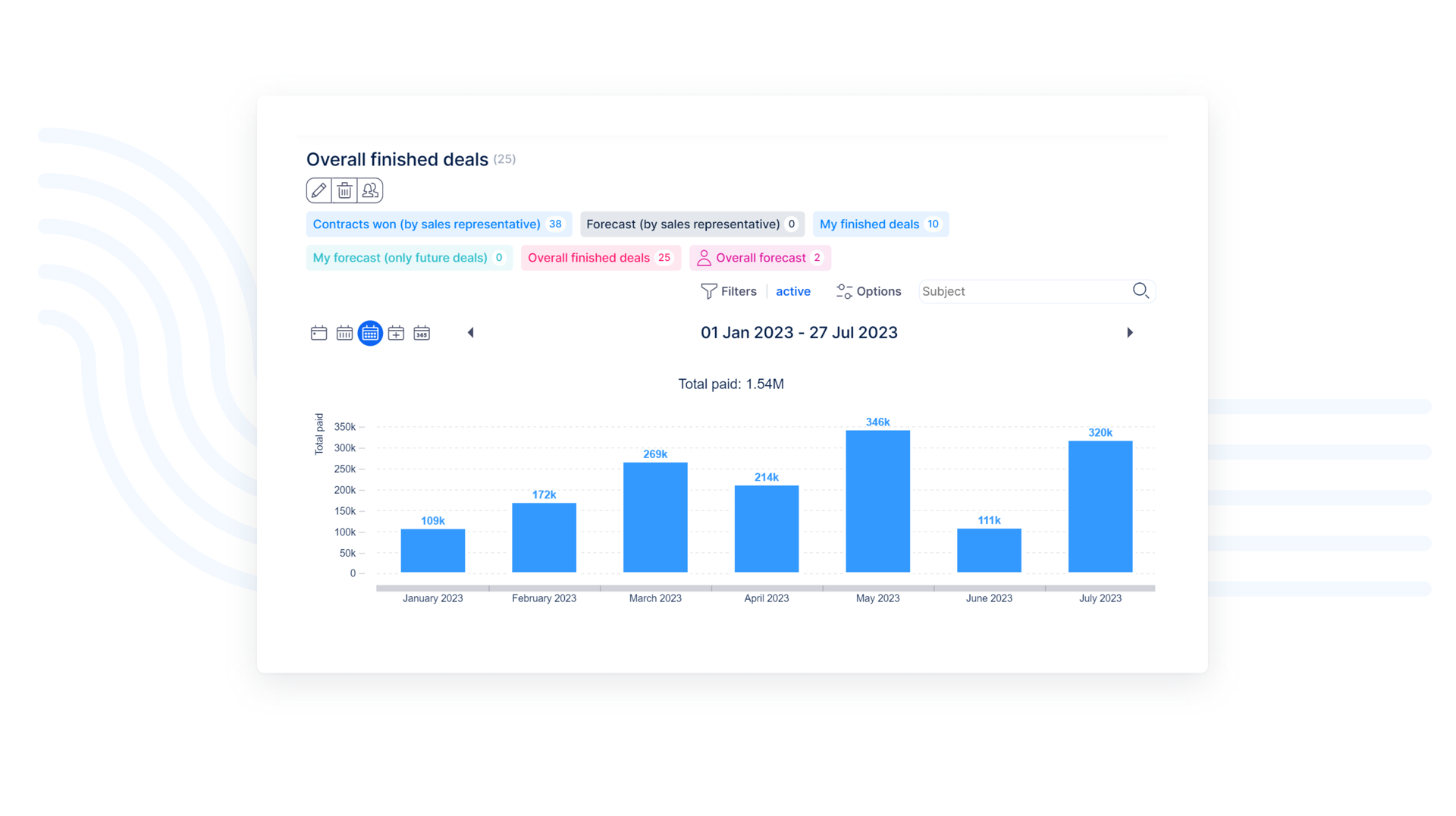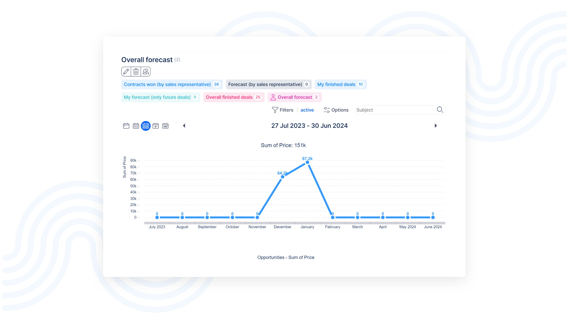 W ramach nowego CRM B2B otrzymasz dostęp do spersonalizowanych raportów prognozowania sprzedaży, które możesz łatwo tworzyć. W naszych scenariuszach opartych na rolach, dyrektor sprzedaży ma jasny przegląd dochodów, wyników menedżerów sprzedaży i potencjalnych klientów. Zobacz, którzy przedstawiciele handlowi są na dobrej drodze do przekroczenia swoich celów dzięki tablicom wyników w czasie rzeczywistym.