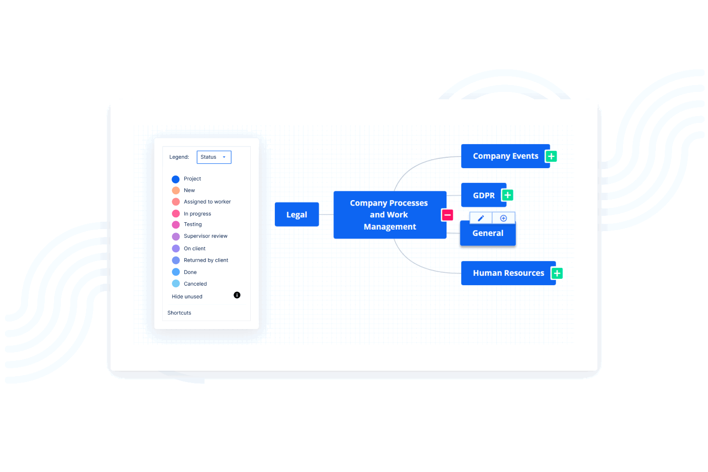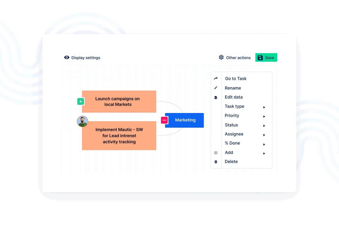 Chcesz zobaczyć wszystkie swoje projekty, problemy i podproblemy w przejrzystym przeglądzie w stylu mapy myśli? Nasz plugin Strukturyzacji Pracy ma to dla Ciebie. Pozwala on na zobaczenie każdego kroku planowania projektu i jego realizacji jednocześnie. Dzięki najbardziej przejrzystemu wizualizacji i intuicyjnemu narzędziu przeciągnij i upuść, zawsze będziesz na bieżąco z wszystkim.