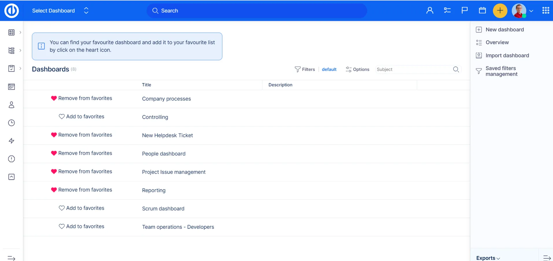 Every user, project or working team should have their own dashboard, which organizes their daily work. Dashboards are fully customizable, allowing you to add/remove modules from the list and save dashboards as templates. Plus, dashboard templates for the most common roles are already prepared for you.