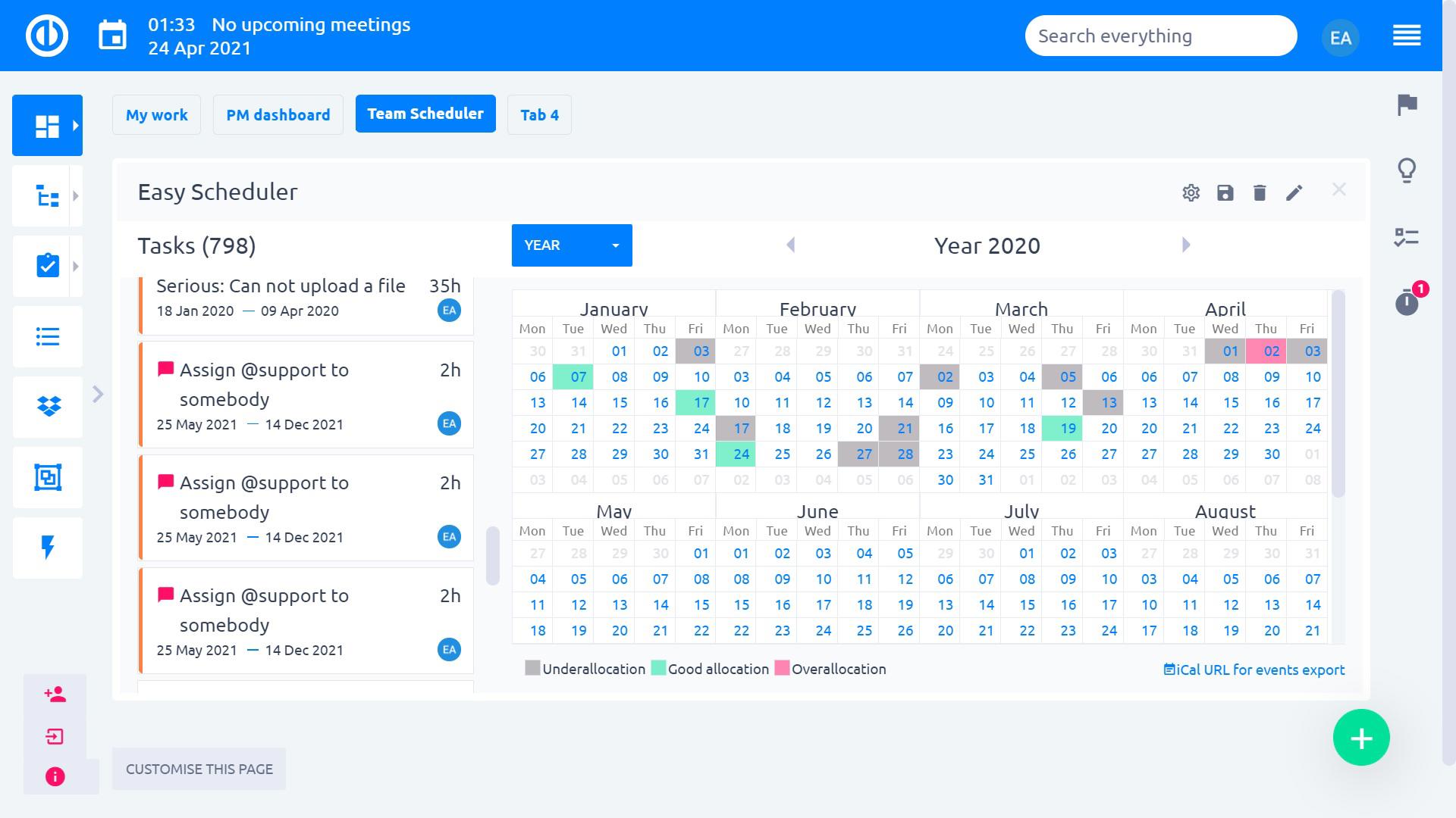To see only the appropriate tasks you need to schedule, just use the "Filters" menu for that purpose. You can save your filters as tags in the heading (upper left corner), which makes it easy to apply the right filter with one click only. Just as easily, you can select the users who you need to allocate the tasks to (from the Users menu).