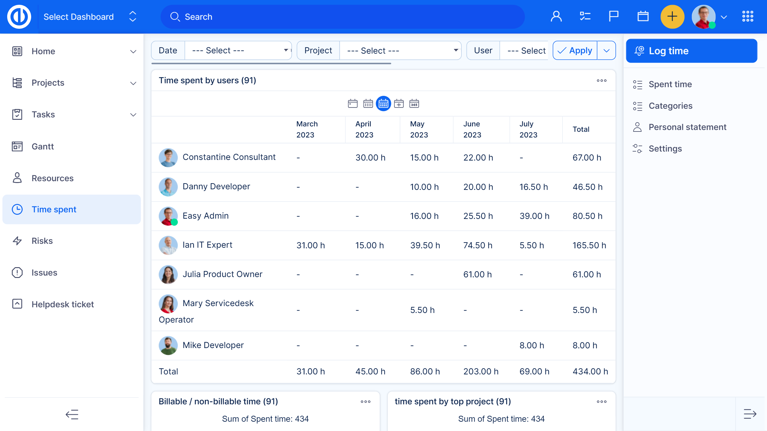 - urmarirea timpului pentru proiecte / sarcini / utilizatori / activitati