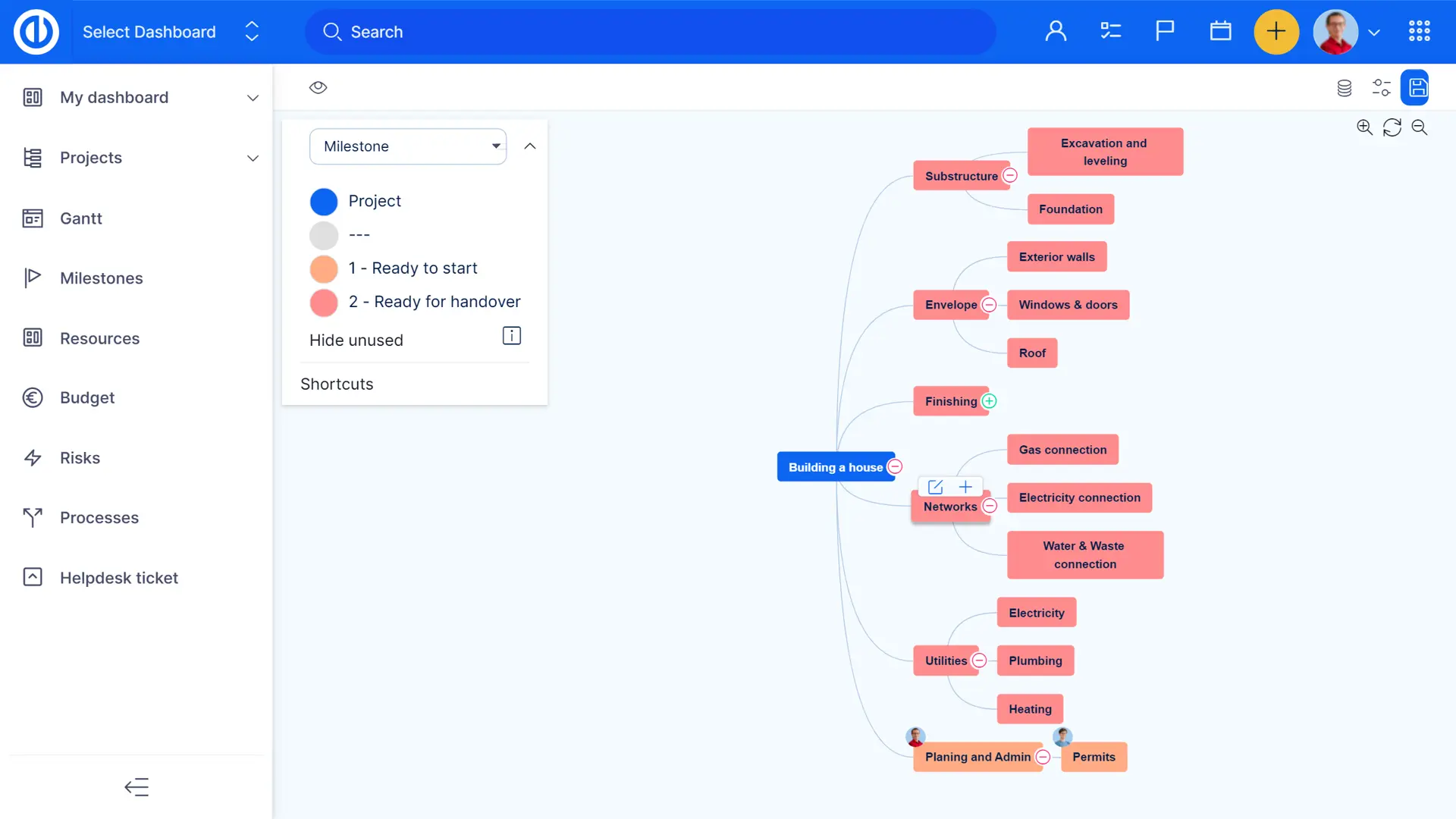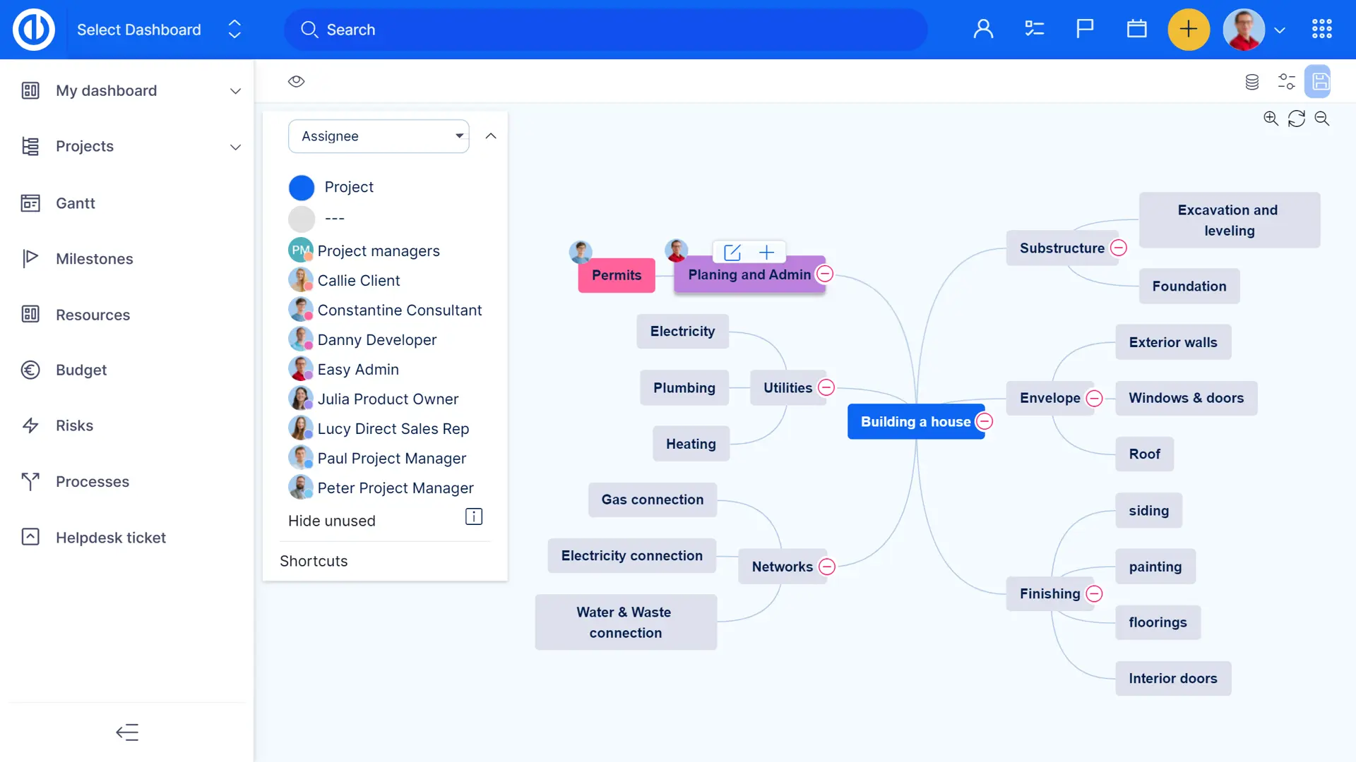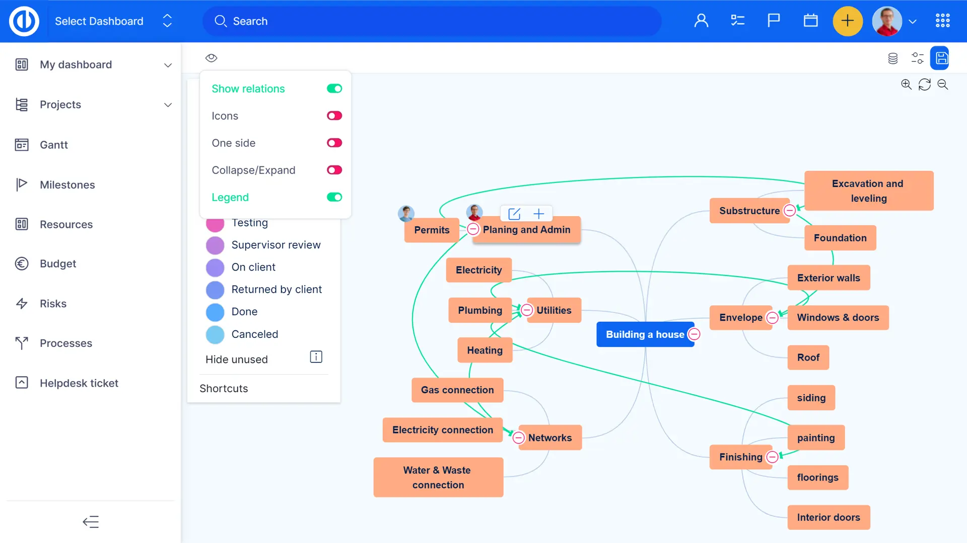 - Визуализация проектов, задач и подзадач в виде интеллект-карты