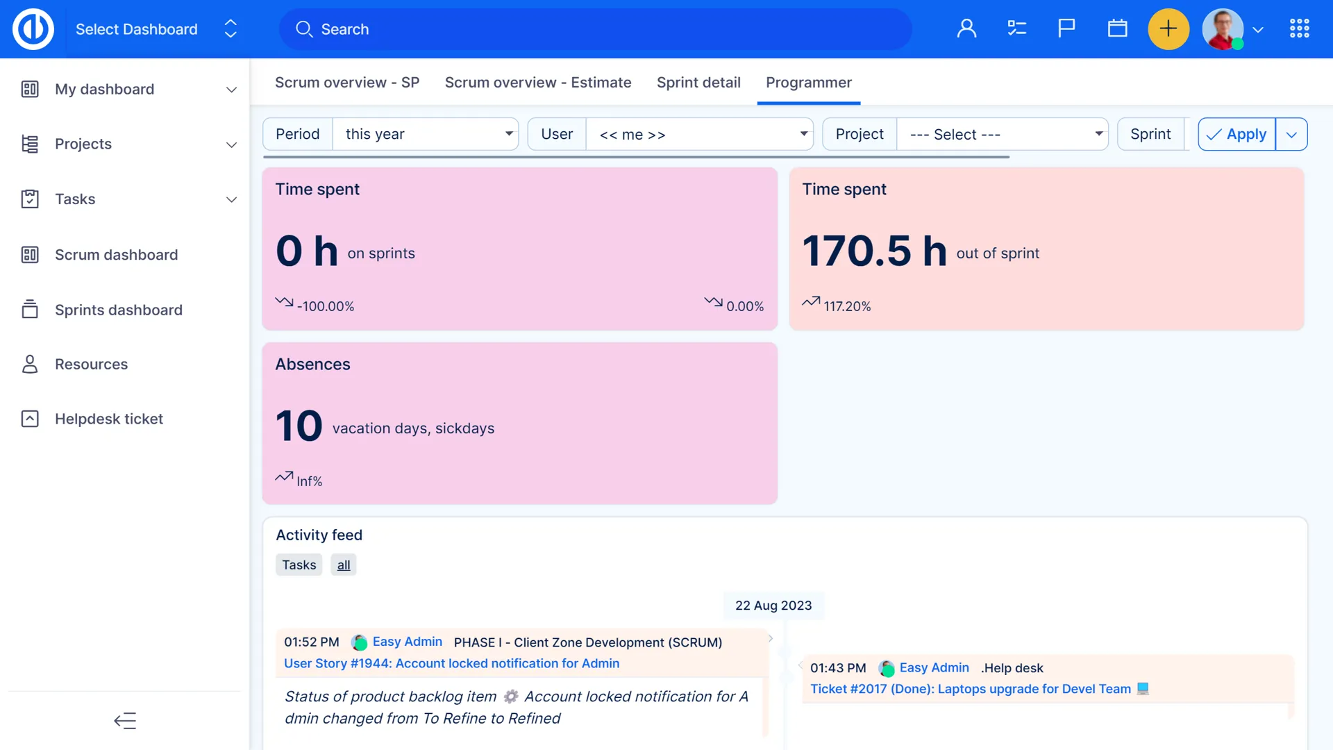 Crafted for Product Owners and Scrum Masters, this personal dashboard offers an at-a-glance overview of essential real-time performance metrics for agile management.