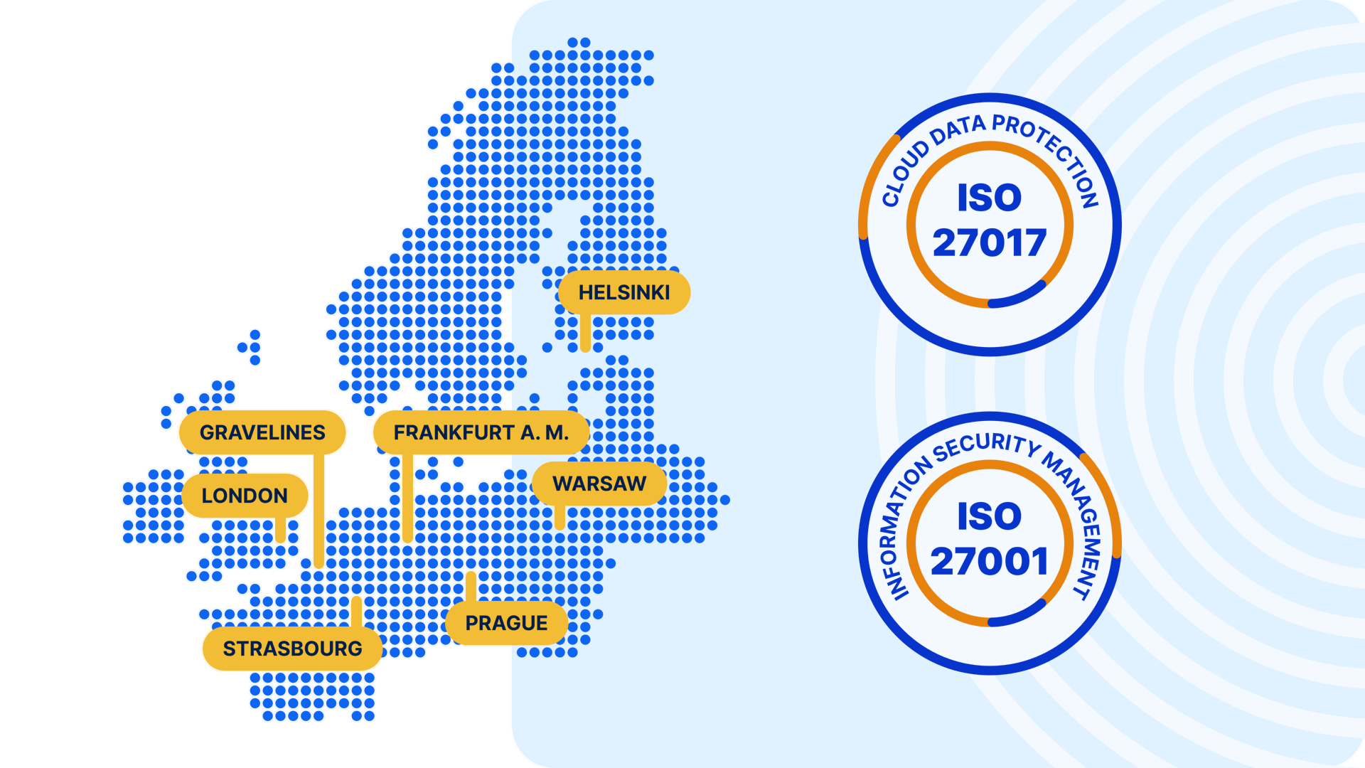 Naše řešení běží výhradně v evropských datových centrech s certifikací ISO 27001, kde jsou vaše citlivá data chráněna evropským právem – bez rizik plynoucích z jurisdikcí mimo EU, jako je například americký CLOUD Act.