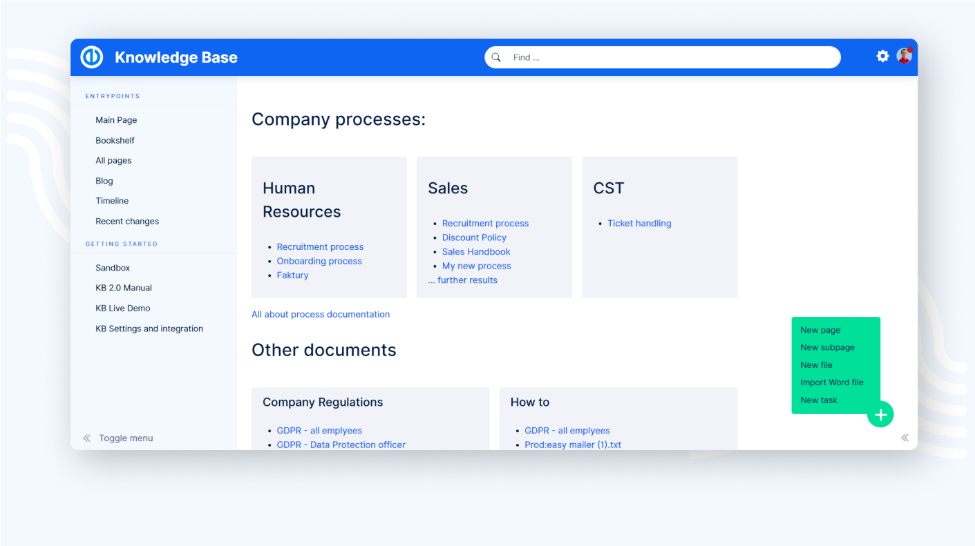 ปรับปรุงการดำเนินงานของบริษัทของคุณโดยการเก็บความรู้ไว้ที่เดียวกัน ทำให้ข้อมูลสามารถเข้าถึงได้ง่าย แค่คลิกเดียว เราใช้ฐานความรู้ของเราที่มีโครงสร้างเป็นวิกิตามเทคโนโลยี MediaWiki โอเพนซอร์ส มีการค้นหาที่ซับซ้อนและเครื่องมือแก้ไขที่มีประสิทธิภาพ ทำให้เป็นเครื่องมือที่ยอดเยี่ยมสำหรับความรู้องค์กรใดก็ได้