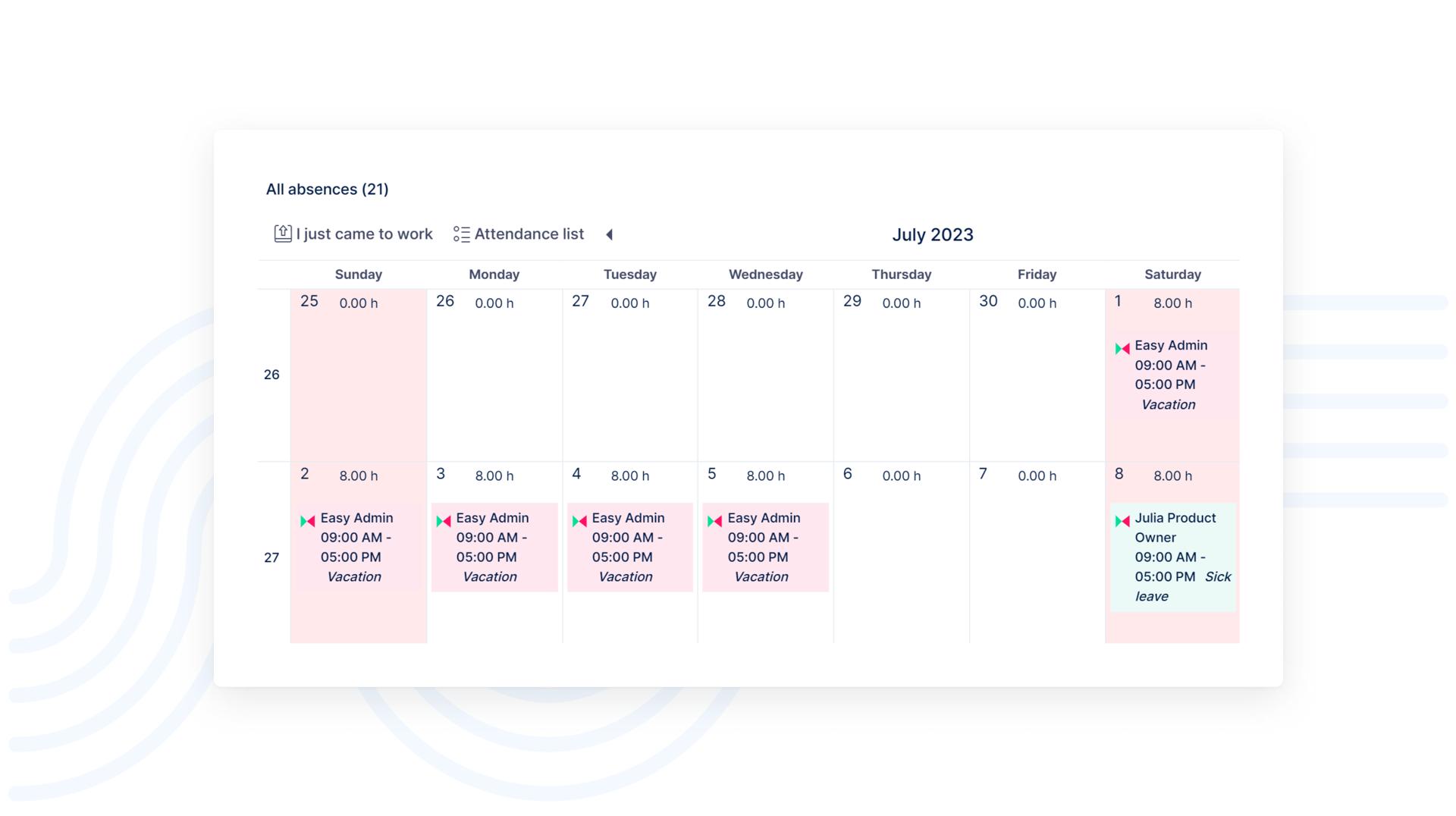 Bu Easy Redmine eklentisi, işe devam süreçlerini sistemleştirir. Çalışanlar, kişisel sayfa takvimine devam planlarını ve kayıtlarını yaparlar. Bir yönetici, istenen izinleri onaylama/reddetme/yorumlama olasılığıyla tüm kullanıcılar için devam planları, tabloları ve istatistiklere sahiptir.