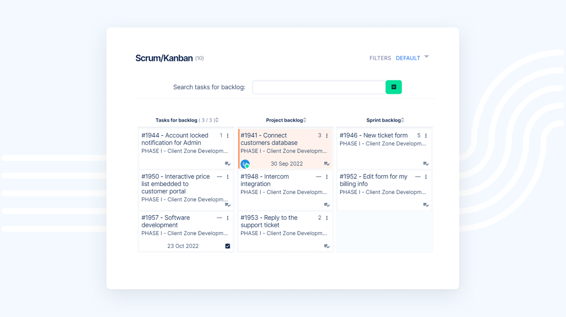 Використовуйте фільтри, щоб легко навігуватися по беклогам проектів та призначати завдання для конкретних спринтів за допомогою перетягування. Уважно складайте свої беклоги, щоб ваші спринти в Redmine працювали без збоїв.