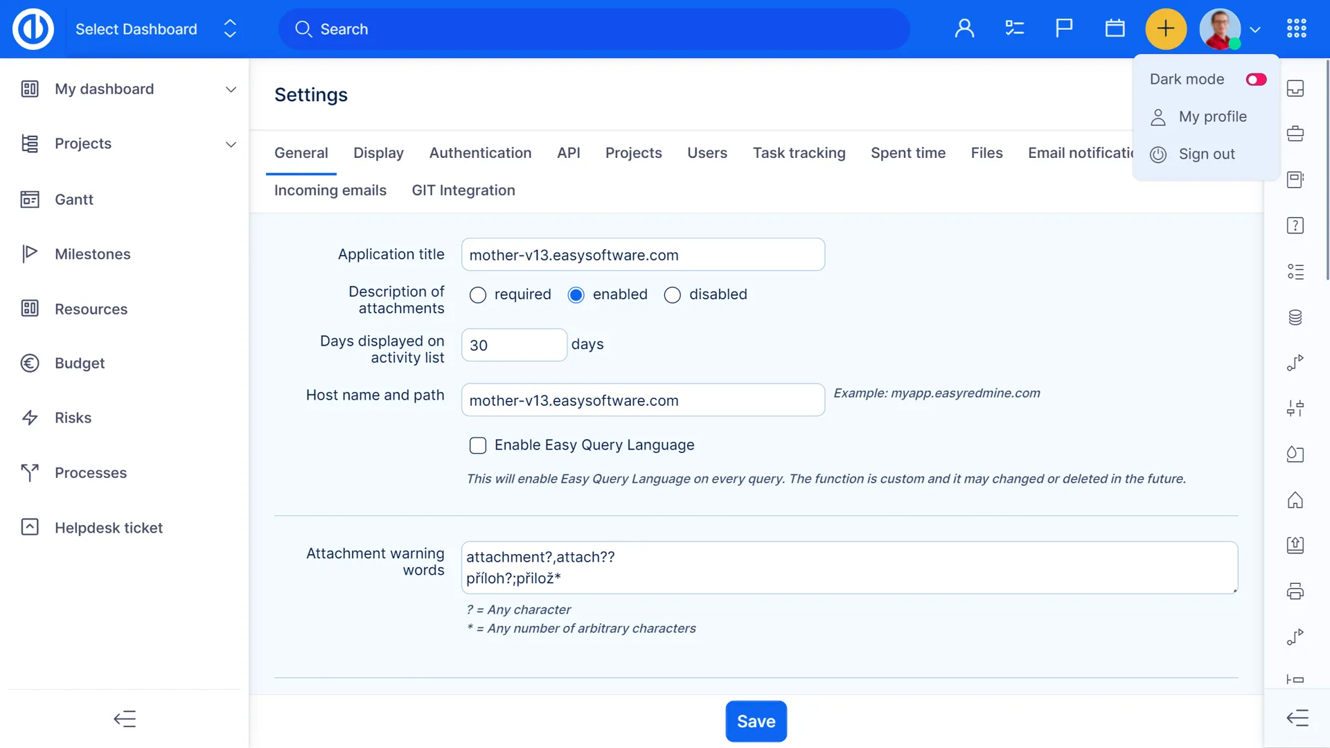 Easy Redmine поставляється з 3 темами дизайну, щоб задовольнити потреби різних користувачів - Default, Compact та Dark. Кожен користувач може перемикатися між темами в своєму профілі користувача.