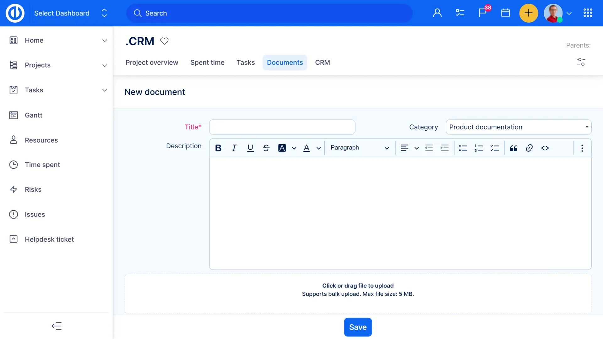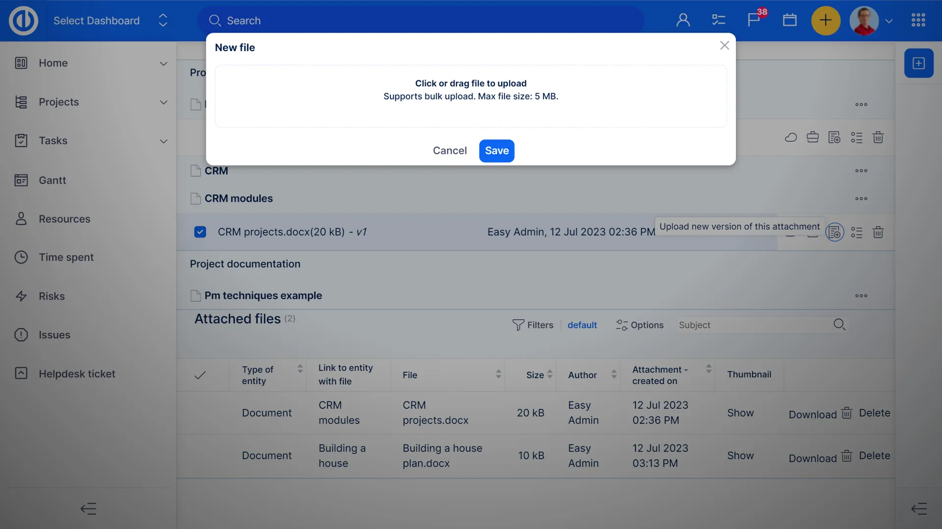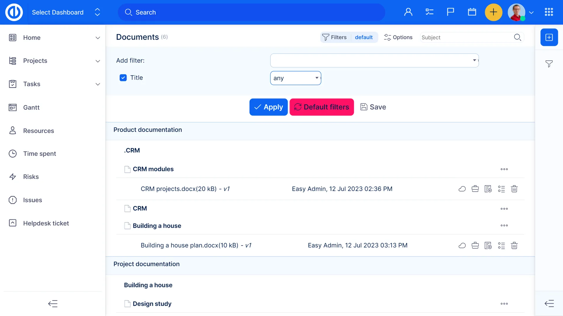 Документи можуть бути додані до проектів та завдань. Документи проекту можуть бути категоризовані за правами доступу на основі ролей. Документи завдань у межах проекту чітко перераховані в категорії "вкладення завдань". Документи можуть бути спільно використовувані, версійовані, шукані та редаговані в Інтернеті.