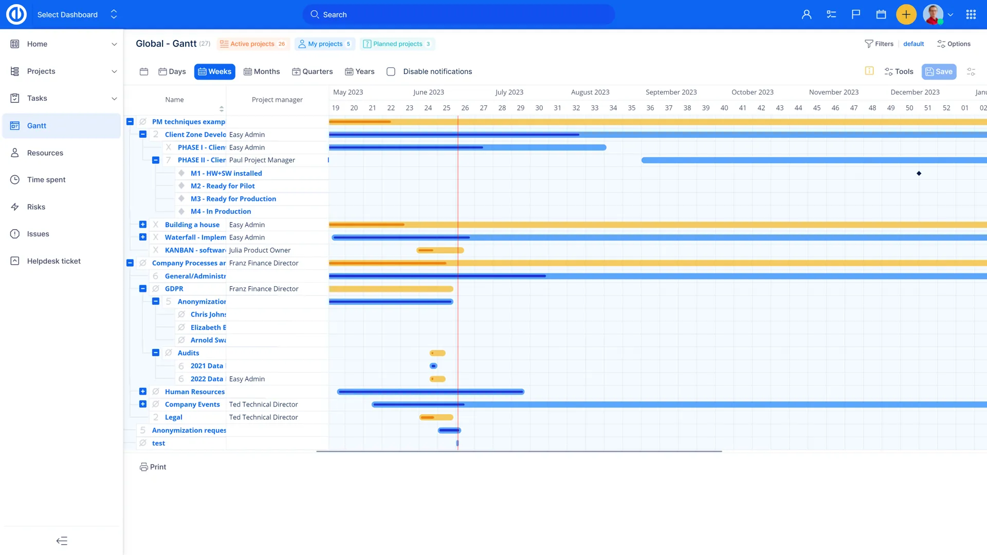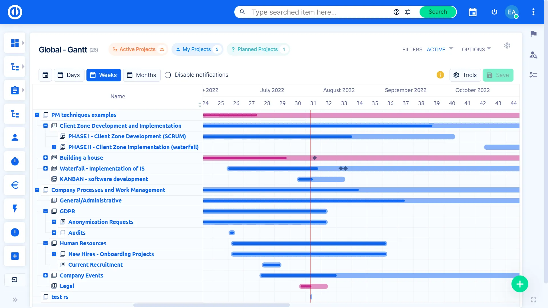 Easy Gantt на глобальному рівні дозволяє працювати зі всім деревом проекту, включаючи всі пов'язані завдання, віхи, зв'язки, затримки тощо на одному екрані. Головною перевагою є усунення хаотичного перемикання між окремими проектами при роботі з кількома проектами одночасно.