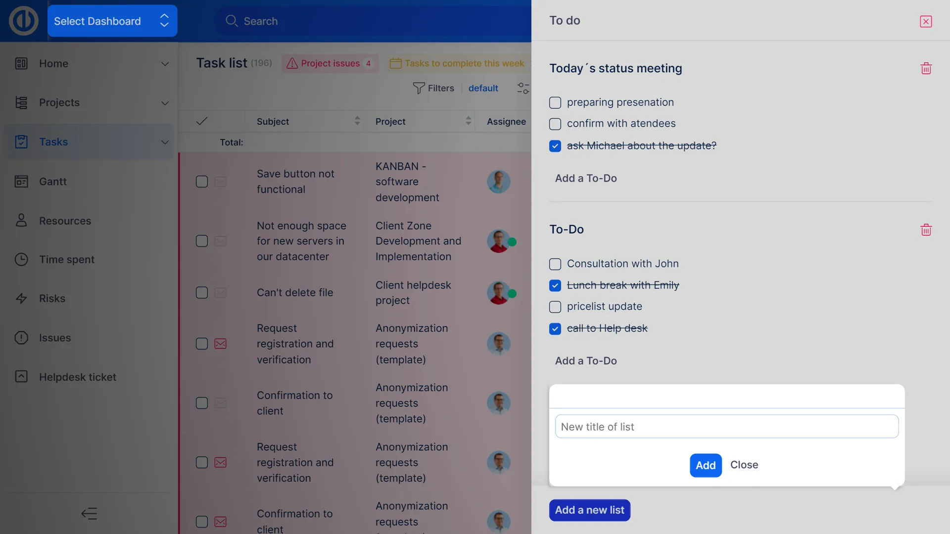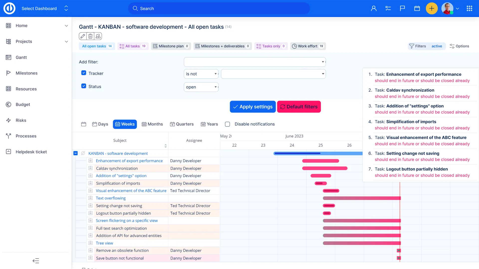 Панель призначень може показати вам статус, назву завдання, трекер завдань, контакт, дату та виконавця для кожного створеного завдання. Перегляньте, які завдання виконані, знаходяться в процесі виконання або прострочені - таким чином ви будете знати, які завдання потребують вашої уваги, щоб дотримуватися плану/графіку вашого проекту.