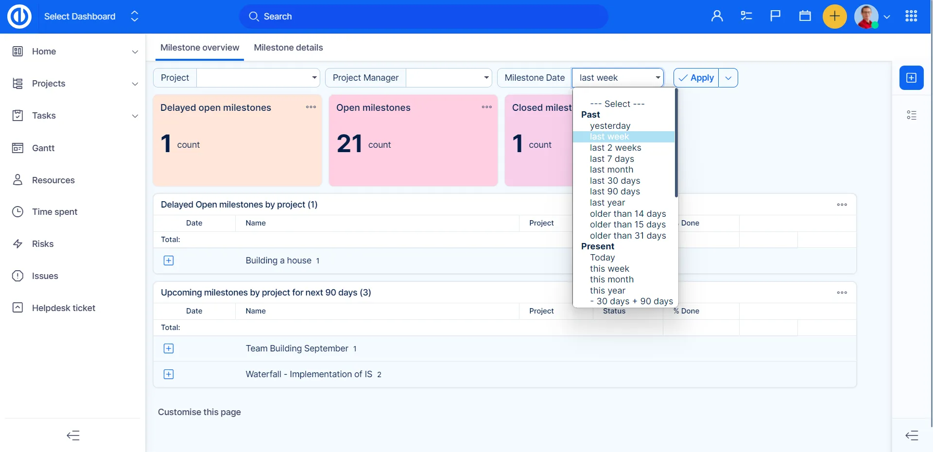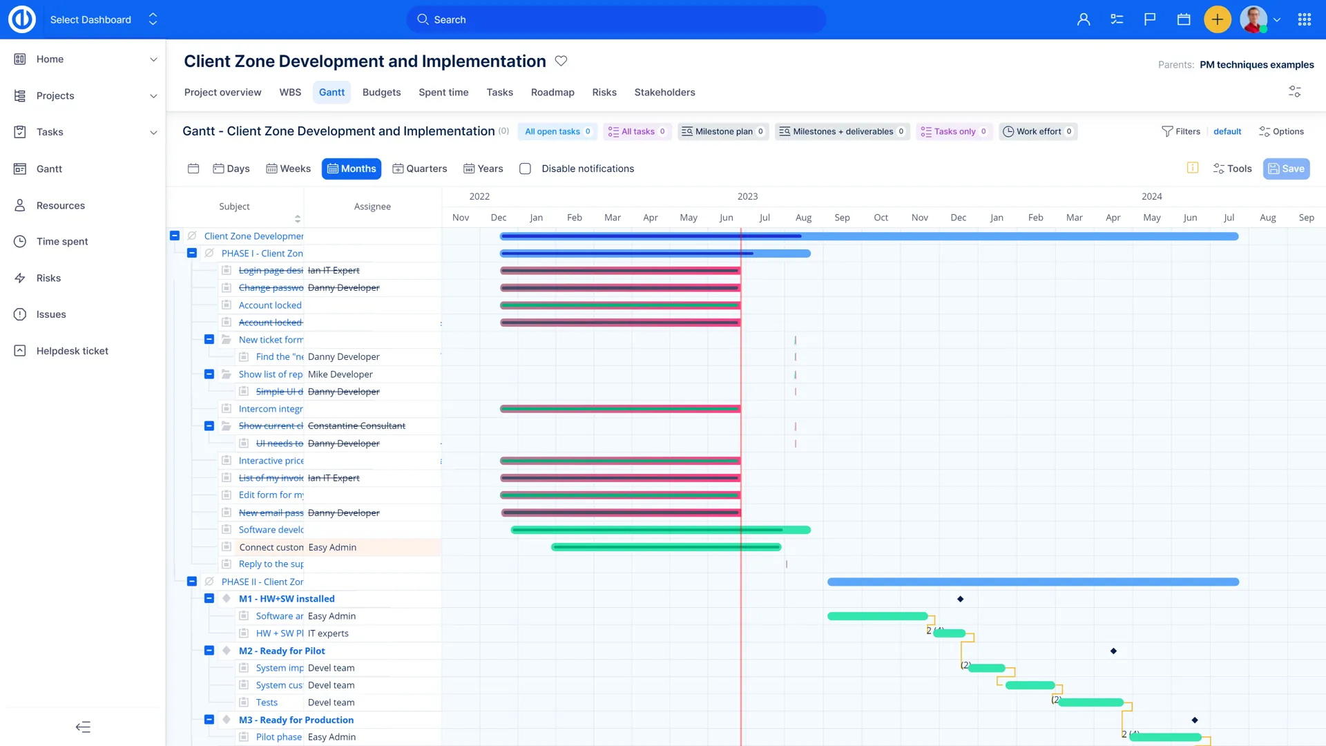 Відстежуйте відкриті/закриті етапи за проектами так само, як оцінений та витрачений час на окремі етапи. Ця інформаційна панель допомагає менеджерам проектів та портфелів переконатися, що прогрес проектів відповідає початковому плану/графіку проекту.