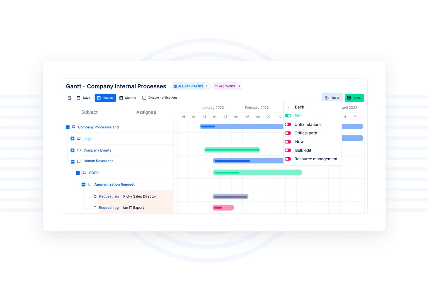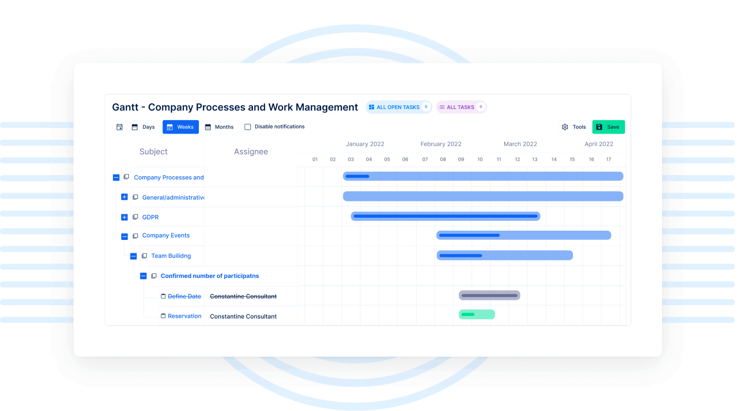 З нашою діаграмою Ганта ваші батьківські та дочірні задачі завжди чітко візуалізовані. Батьківські задачі можна розгорнути, щоб відобразити їх дочірні задачі.